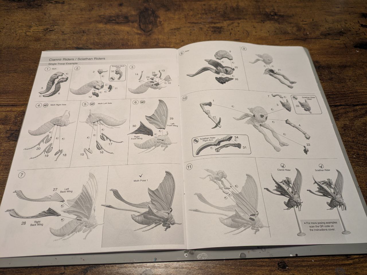 Im Gegensatz zu den Guardians finde ich die Entscheidung, hier nicht die vollständige Anleitung zu drucken, fast schon fahrlässig. Die Ciannir- beziehungsweise Sciathan Riders sind wirklich sehr komplexe Bausätze, deren vollständige Anleitung nicht hinter einem QR-Code versteckt werden sollten.