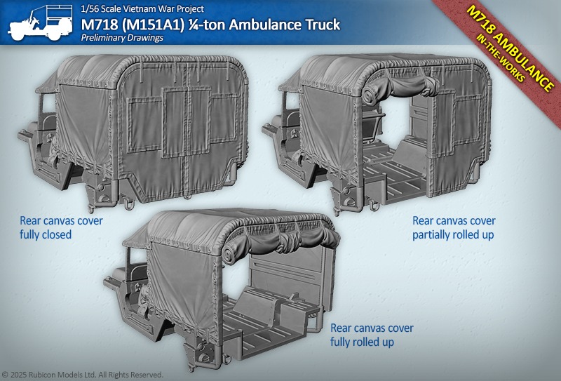 Our Second Weekend Teaser for May… more vehicles incoming! The M718 (M151A1) 1/4 ton ambulance was designed to carry ambulatory and litter patients. The cargo area of the M718 is longer and higher to accommodate litters and patients.In Vietnam, many M718s were used for general base transport or for ambulatory (walking wounded) troops. With the mounts, rails, and brackets removed, this provided a rear seating area for four personnel, along with two front seats.Our design provides different layout arrangements for your creative mind.