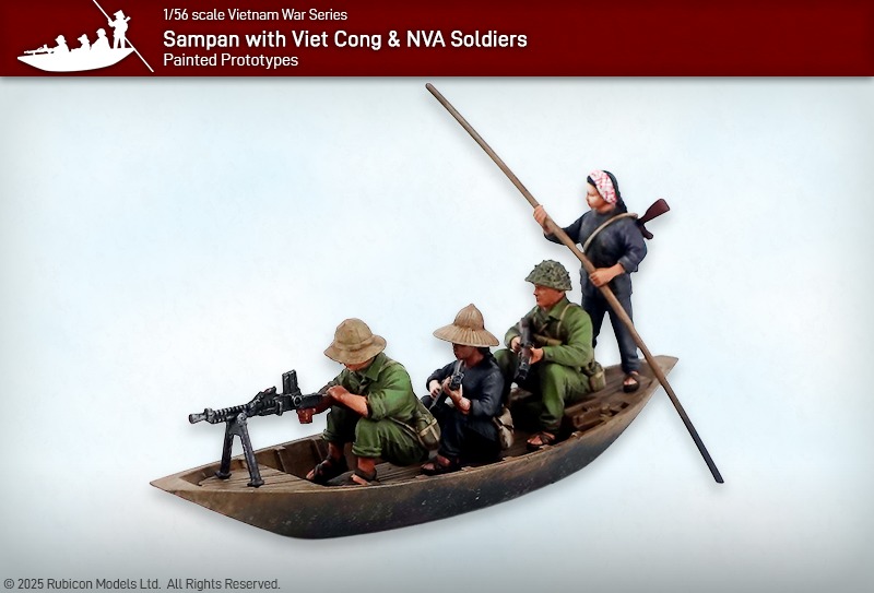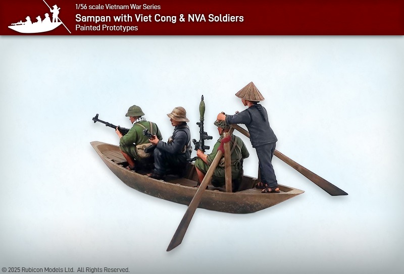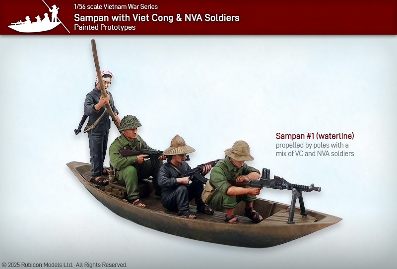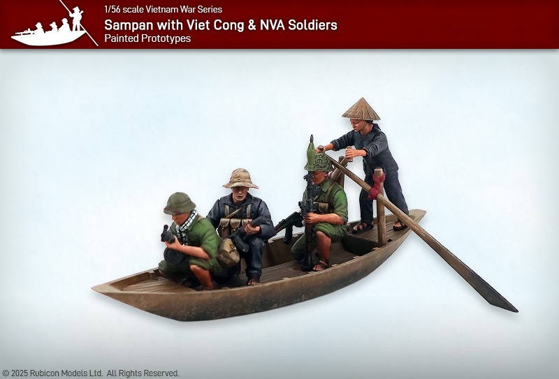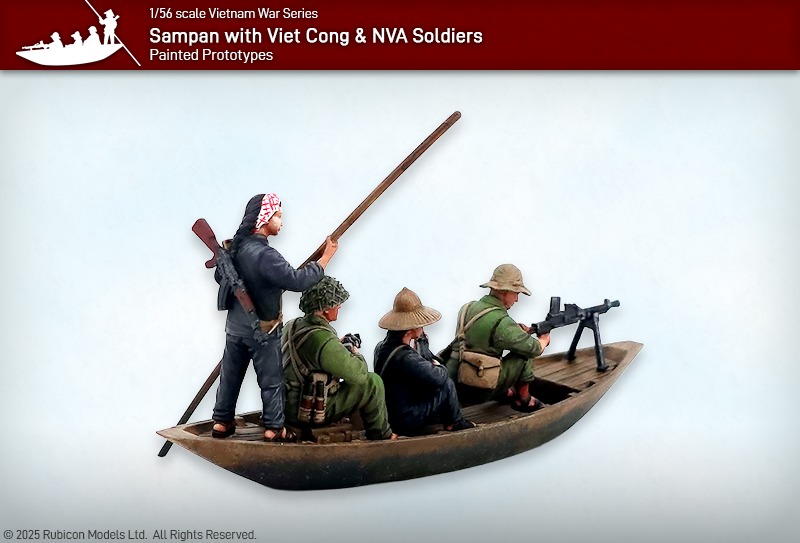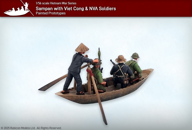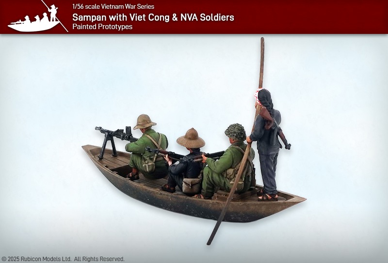 Our last Weekend Teaser for November… Painted Samples for our Vietnam War Sampan prototypes! Two varieties of sampan with a mix of VC fighters and NVA soldiers. These figures can be swapped between sampans for variations. A sampan is a relatively flat-bottomed Chinese wooden boat. Sampans may be propelled by poles, oars (particularly a single, long sculling oar called a yuloh „摇橹“) or maybe fitted with outboard motors. Some sampans include a small shelter on board and may be used as a permanent habitation on inland waters. Sampans are generally used for transportation on rivers and are often used as traditional fishing boats. The word „sampan“ comes from the original Cantonese term for the boats, sāam báan (三板), literally meaning „three planks“.