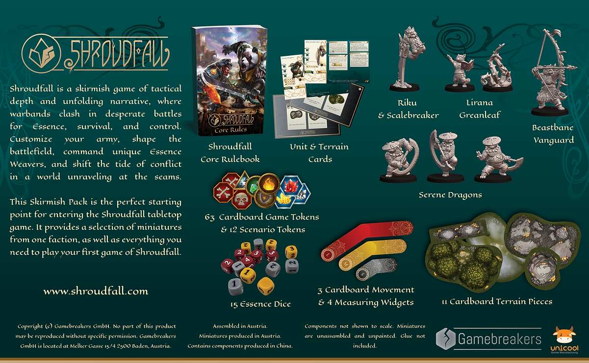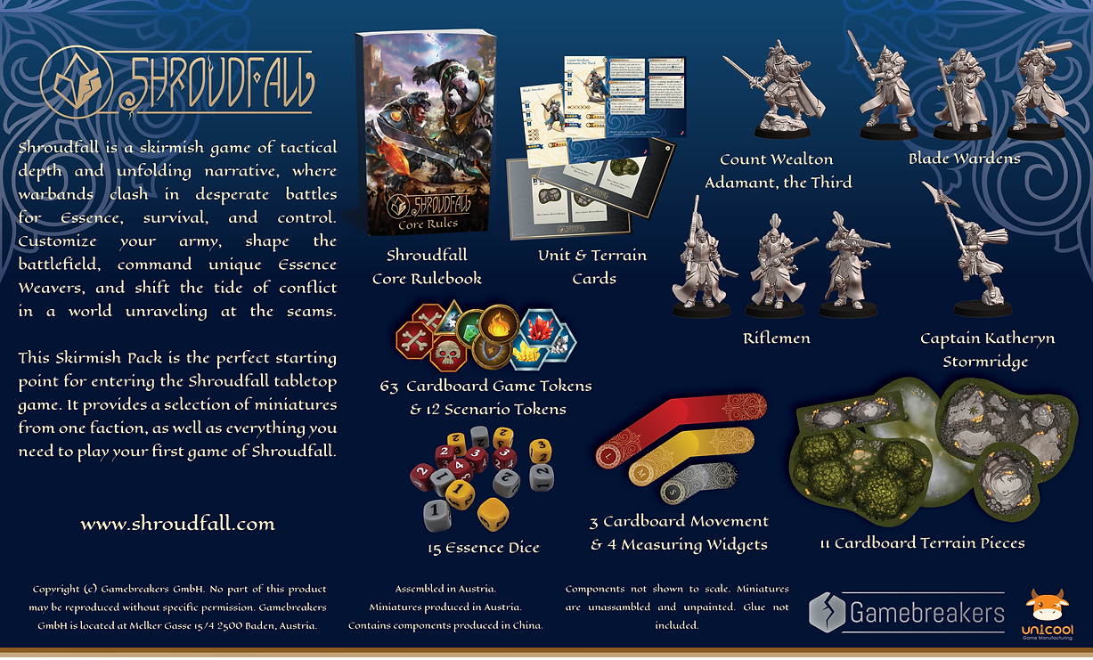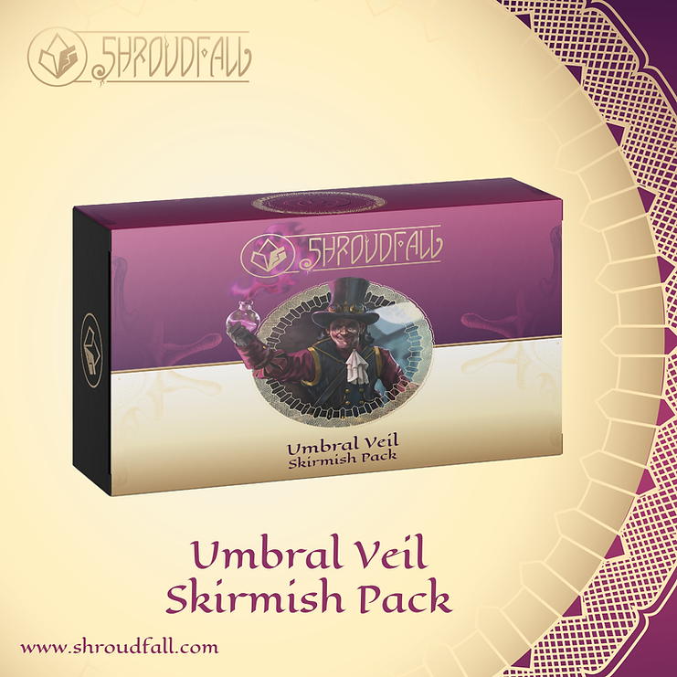 The best way to begin your journey into Shroudfall is with a Skirmish Pack. Each set is a complete, ready-to-play set designed for both newcomers and seasoned commanders. Inside, you’ll find everything you need to jump straight into battle: a softcover rulebook, dice, tokens, terrain, a starter scenario and detailed miniatures from one of the four launch factions: Silver Line, Chosen of the Spirit Tree, Umbral Veil, and Bloodthorne.