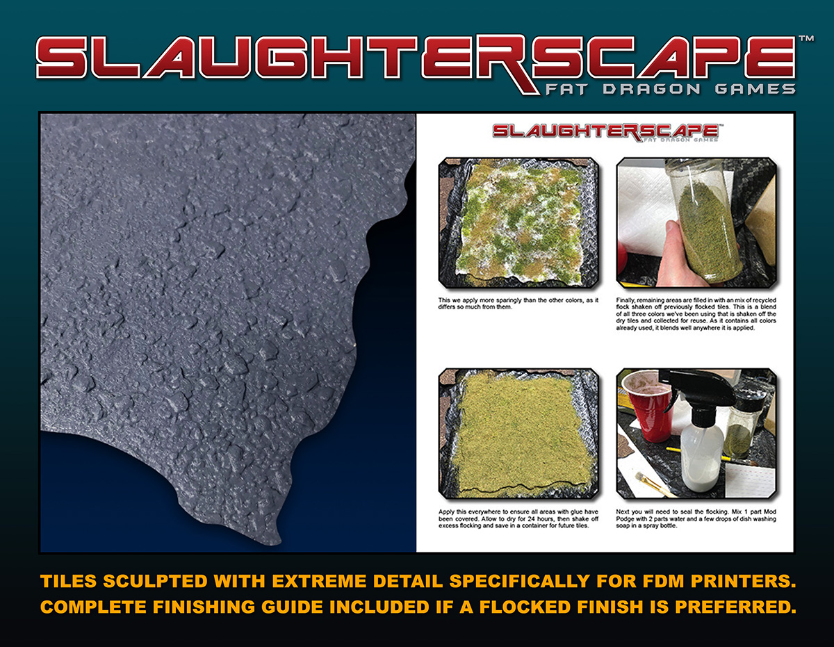 Design your ultimate tabletop battlefield with Slaughterscape’s modular 8”x8” tiles, tailored for all miniature scales from 28mm down to common mech-scale miniatures! These durable, 3D printable tiles feature organic edges that blend seamlessly, secured by an innovative outer frame to prevent shifting. Forget dangerous styrofoam cutting and toxic fumes to make your wargame terrain, Slaughterscape delivers highly detailed 3D printable modular landscapes for immersive wargaming. Elevate your battles today with Slaughterscape!
