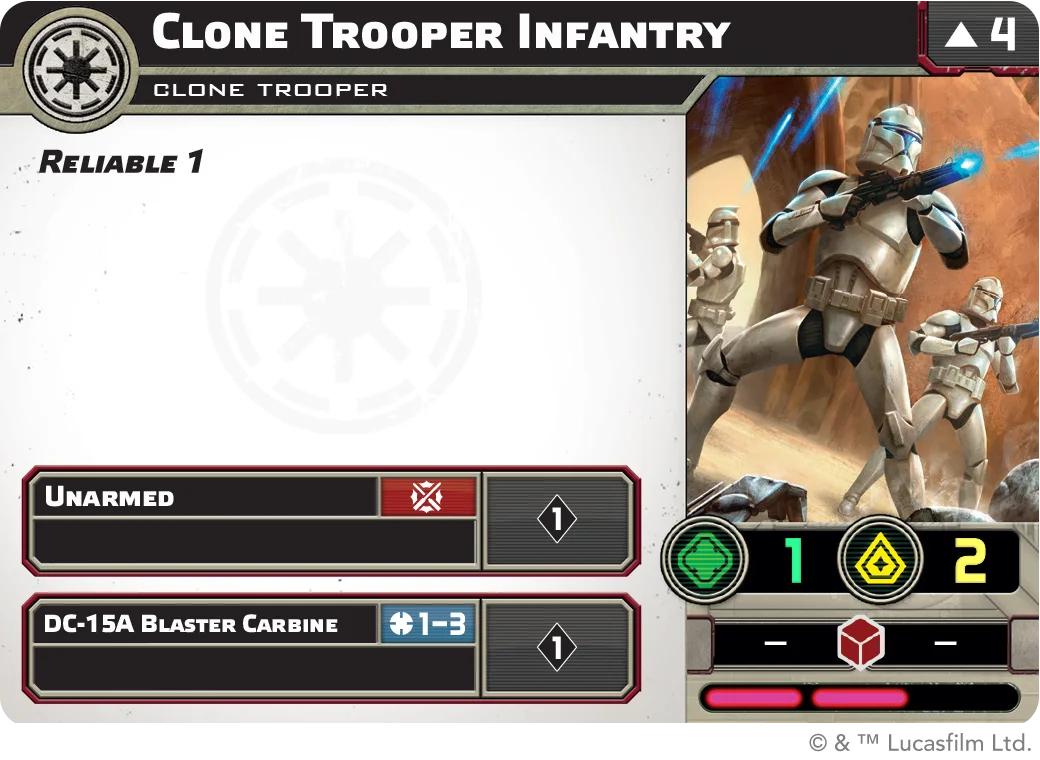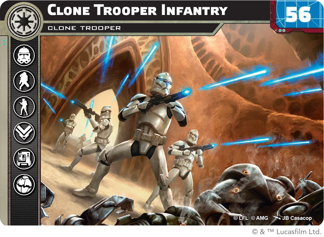 The Clone Trooper Infantry form the backbone of any Galactic Republic army. To set them apart from their peers in other factions, the Clone Trooper Infantry sport a natural Courage value of 2, keeping them markedly cool under fire. The Reliable 1 keyword grants them a Surge token every Round, allowing them to boost either their offense or their defense as the situation demands. The simplicity of their Unit Card betrays a dizzying amount of depth contained within both their Upgrade Cards, to follow, and their unique unit type: the Clone Trooper. Clone Trooper units can share Aim, Dodge, and Surge tokens with other nearby Clone Trooper units, meaning their tokens – whether generated from Reliable 1 or with Aim and Dodge actions – rarely go to waste, as there is always another clone nearby to spend it! This unit type is found on units throughout the faction, allowing an impressive degree of synergy between Commander, Corps, Special Forces, and Support units!