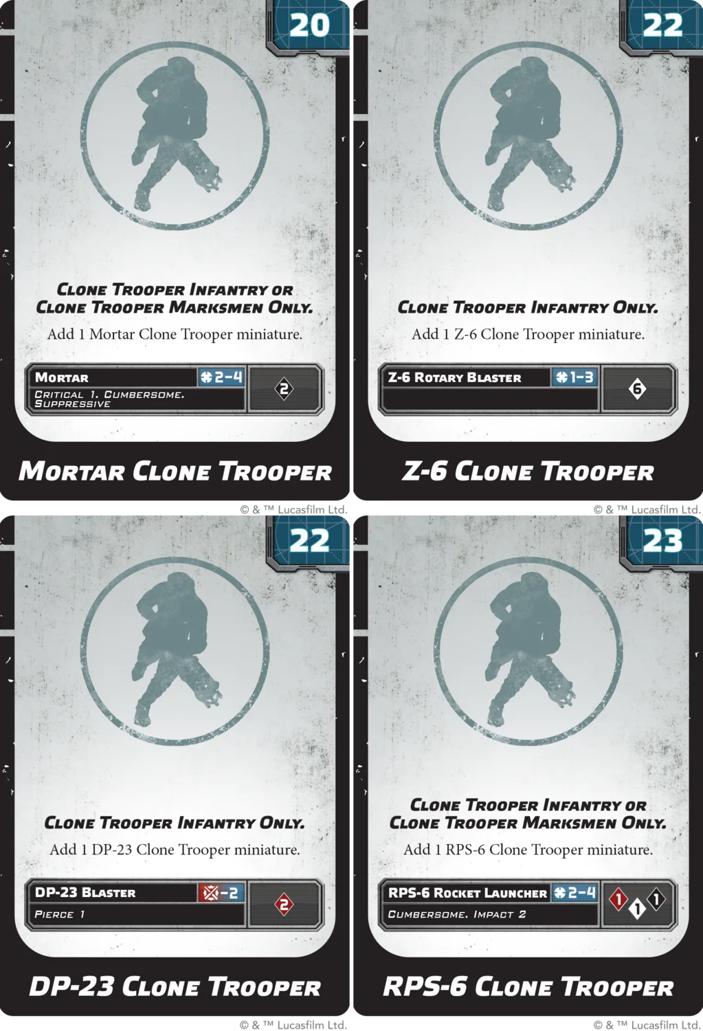The Clone Trooper Infantry are easily the most customisable Corps units in Star Wars: Legion, and this is first evident when presented with their four different Heavy Weapon Upgrade Card options! Each weapon allows the clones to serve a different role on the battlefield, and several are shared with the Clone Trooper Marksmen for even more unique applications. The Z-6 Clone Trooper wields a heavy blaster with a high rate of fire; its 6 white attack dice are not particularly accurate, but can be made quite reliable with Aim and Surge tokens shared to the unit! The DP-23 Clone Trooper is adept at close-range firefights, its Pierce 1 keyword bringing unparalleled firepower to Clone Trooper units fighting at Range 2, or closer! For longer-range engagements, the RPS-6 Clone Trooper can provide the Clone Trooper Infantry with an anti-Armor option via Impact 2. Finally, the Mortar Clone Trooper provides Critical 1 and Suppressive for attacking enemy Troopers at equally distant Ranges, to cover the approach of your other units from relative safety.
