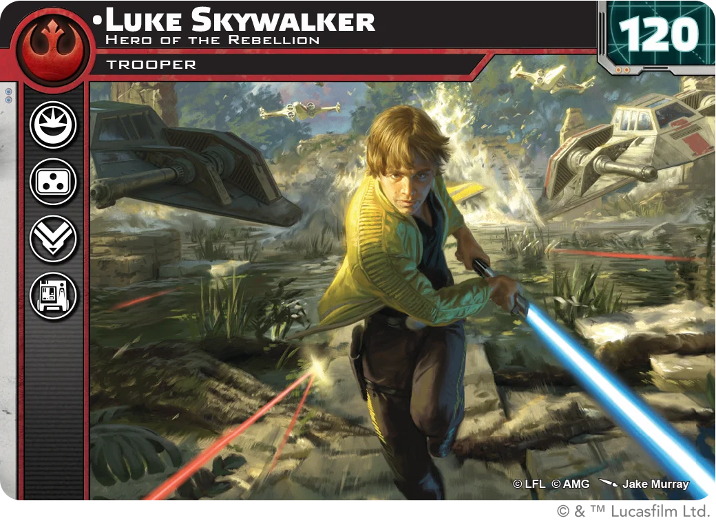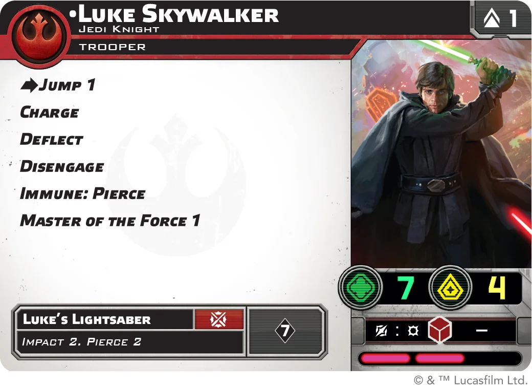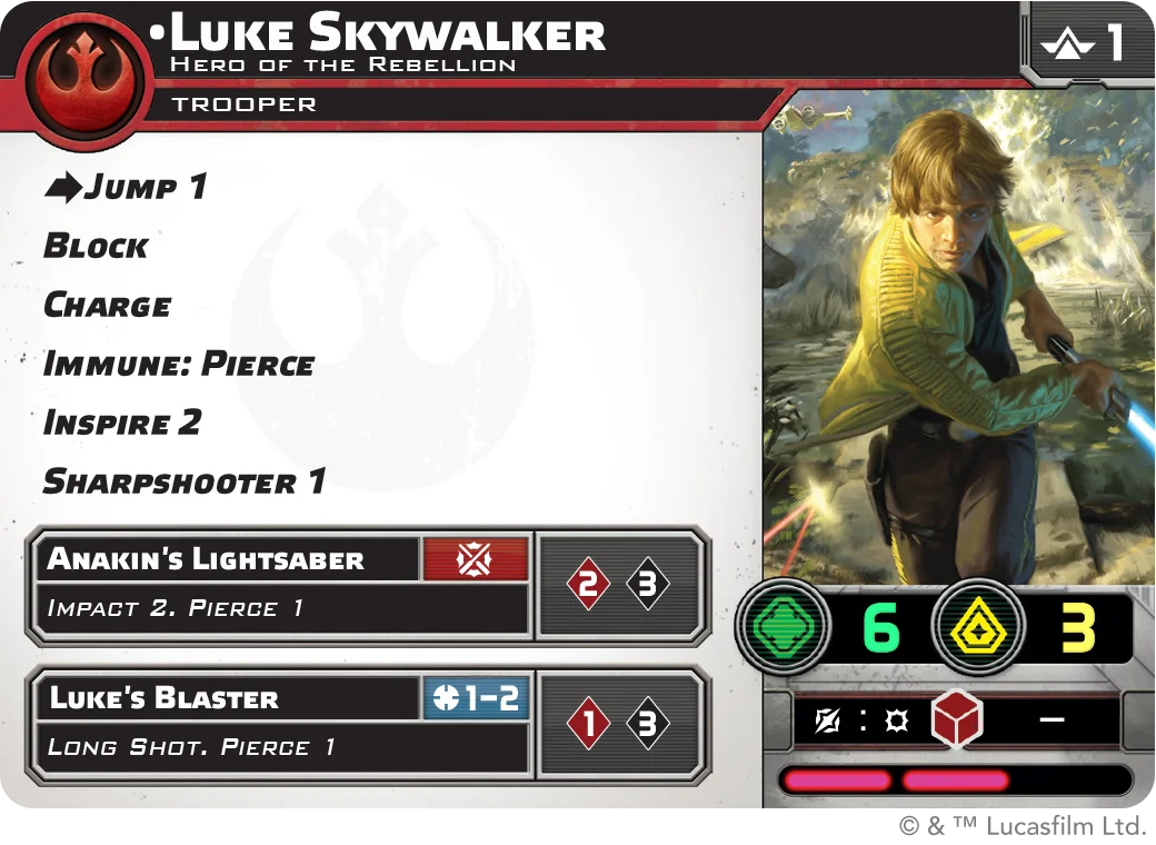 Luke Skywalker, Hero of the Rebellion is one of the original Commander units for Star Wars: Legion and has seen many changes over the years, all combined on his new Unit Card. Brash as is befitting his Skywalker name, Luke comes complete with the Jump 1 and Charge keywords to make him a mobile and formidable duelist even with his modest formal training. But he does not need to dive straight into melee – Luke’s Blaster carries a powerful ranged attack: Long Shot and Pierce 1 combine with his natural Sharpshooter 1 to ensure he never misses his mark.