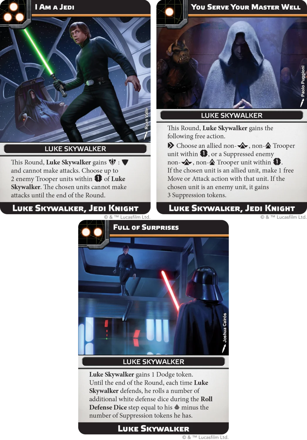 The You Serve Your Master Well Command Card is exclusive to this version of Luke Skywalker, who can equip Jedi Mind Trick to add Suppression tokens to an enemy unit before using the Free Card action to apply even more, likely Panicking them! Full of Surprises synergises with his markedly high Courage value, allowing him to roll up to 4 additional white defense dice when attacked, which become even more powerful when his Deflect keyword is applied. Certainly not least: I am a Jedi allows Luke Skywalker, Jedi Knight to prevent two enemy units from attacking the entire Round, provided he is willing to similarly disarm himself. A well-timed I am a Jedi can turn the game on its head; it is particularly powerful against units that would have attacked more than once if unopposed by Luke, such as Imperial Dark Troopers or Darth Vader when playing his Implacable Command Card!