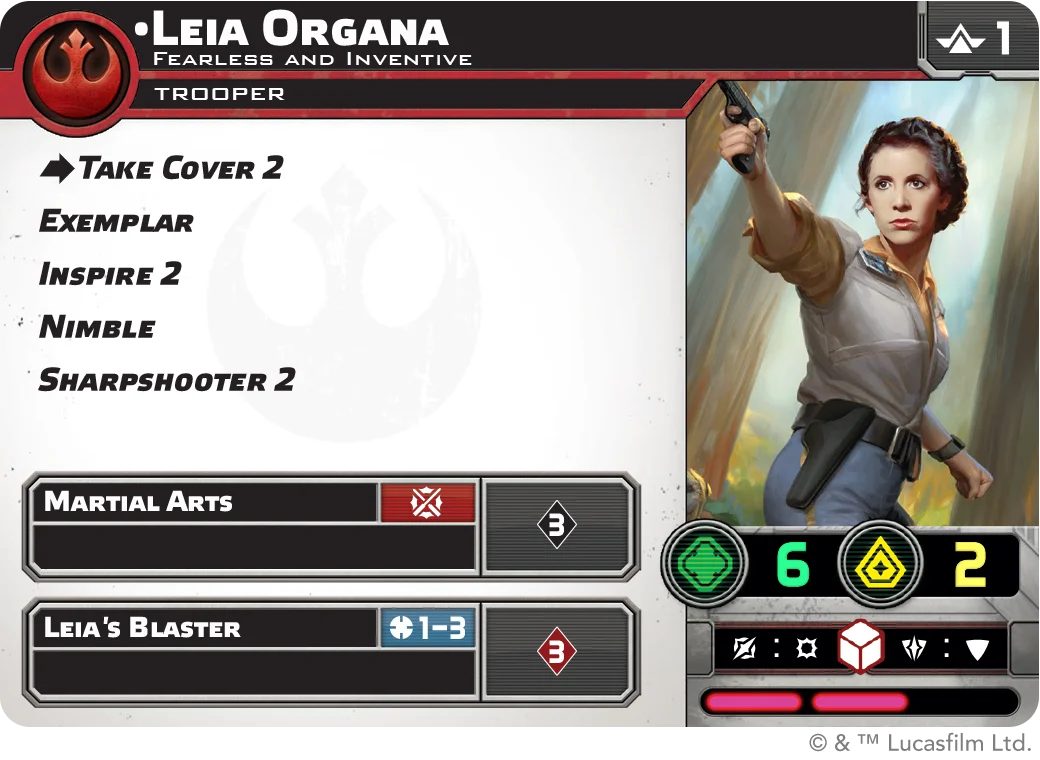 Leia Organa, Fearless and Inventive has been a feature of Star Wars: Legion nearly as long as her brother, Luke, and returns to the game with a similarly refreshed unit card. She now sports the Exemplar keyword, allowing nearby Rebel Alliance units to make use of her Aim and Dodge tokens, the latter of which are particularly powerful in a faction built on a foundation of Nimble Rebel Troopers! The Take Cover 2 Card action keeps her and her allies well-stocked on Dodge tokens, and her native Inspire 2 keeps them cool even under heavy fire. Leia’s Blaster has had its Range improved, allowing her to lend her sharpshooting talents from relative safety within your army and with nearby allies to lend her Backup.