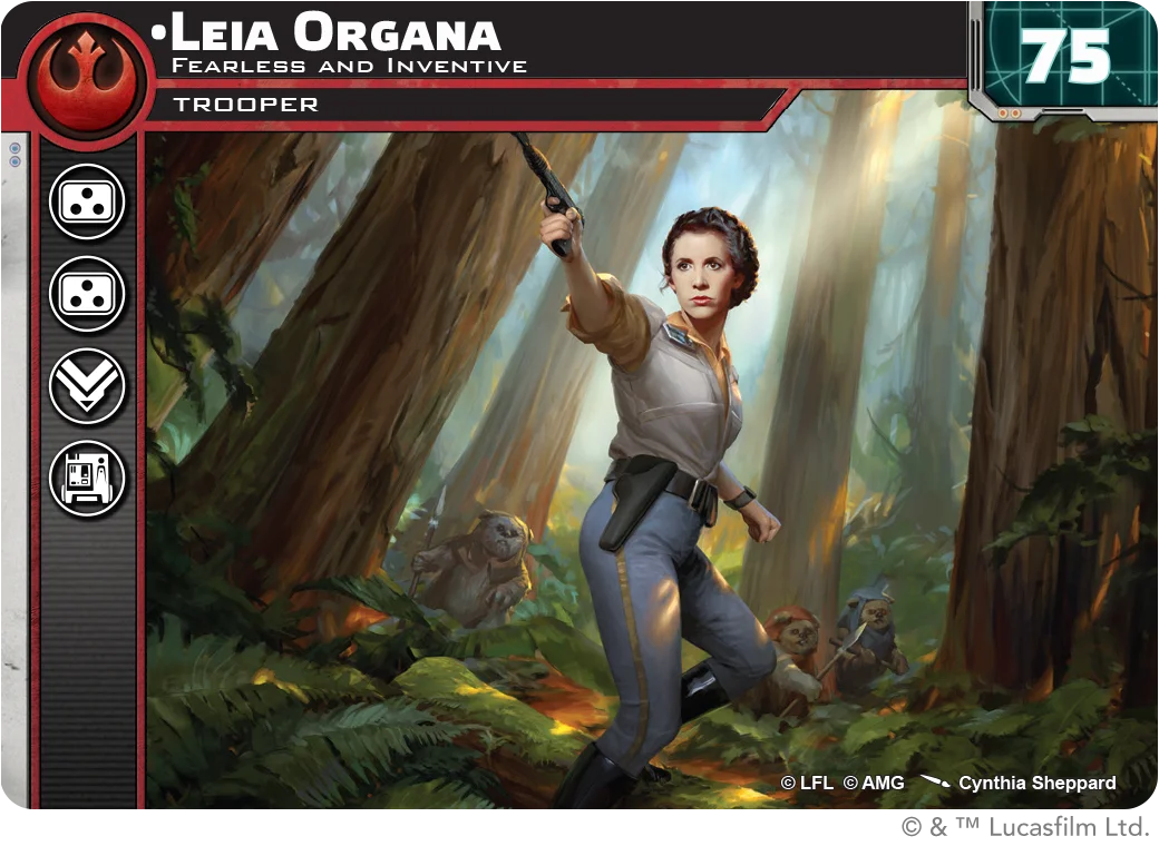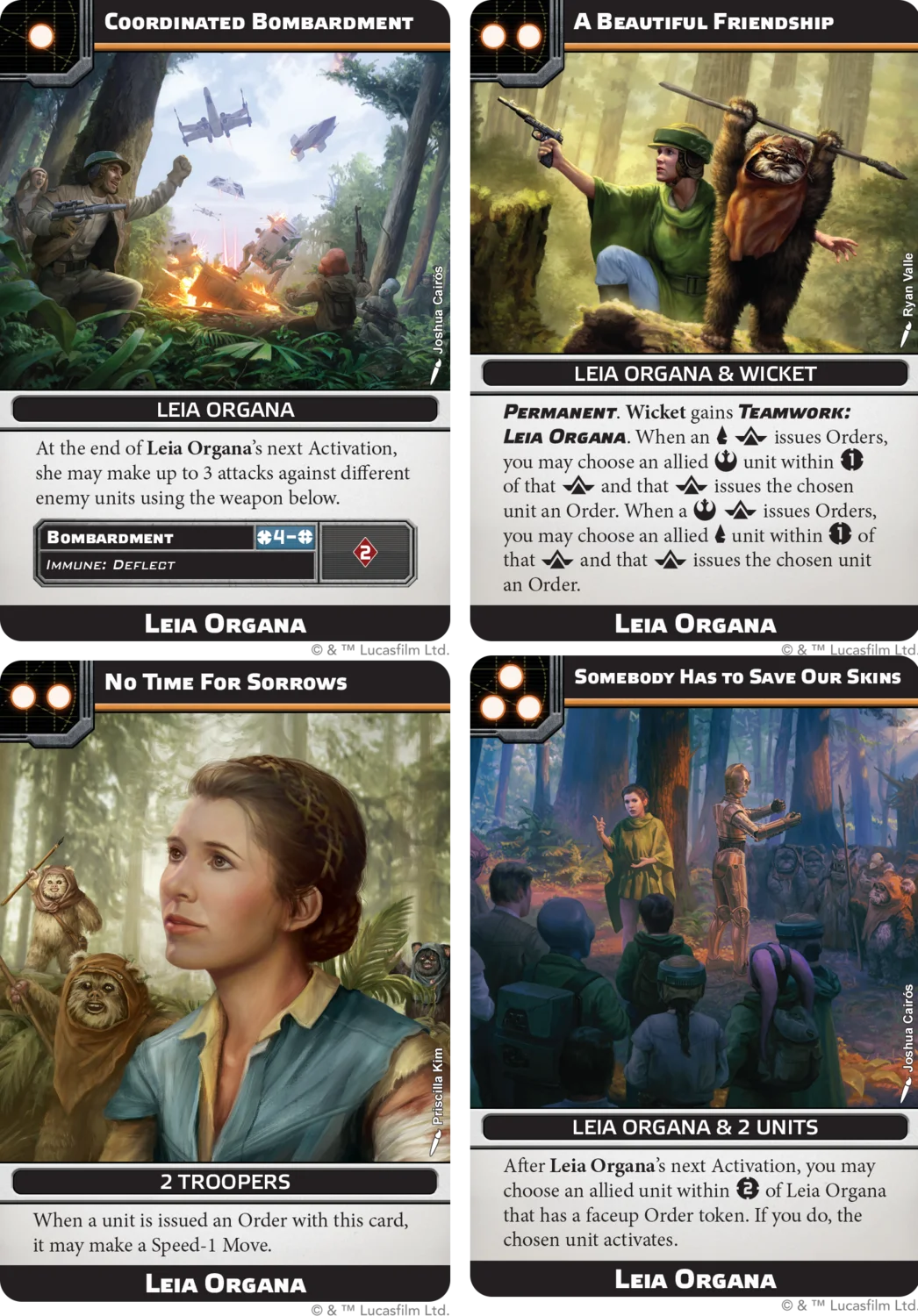 On the topic of fire support, the Coordinated Bombardment Command Card sees Leia calling targets for the Rebel Alliance’s distinguished starfighter squadrons; a powerful opening Command Card or a clutch round closer, defeating an enemy unit leader on a far-flung Command Card with its infinite range! No Time for Sorrows grants a Move to ordered friendly units, allowing for a swift position before the Activation Phase starts properly. Somebody Has to Save Our Skins allows for a rare back-to-back Activation, allowing Leia to Inspire a unit to greater feats right before you Activate them!