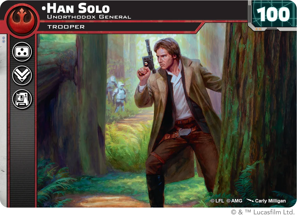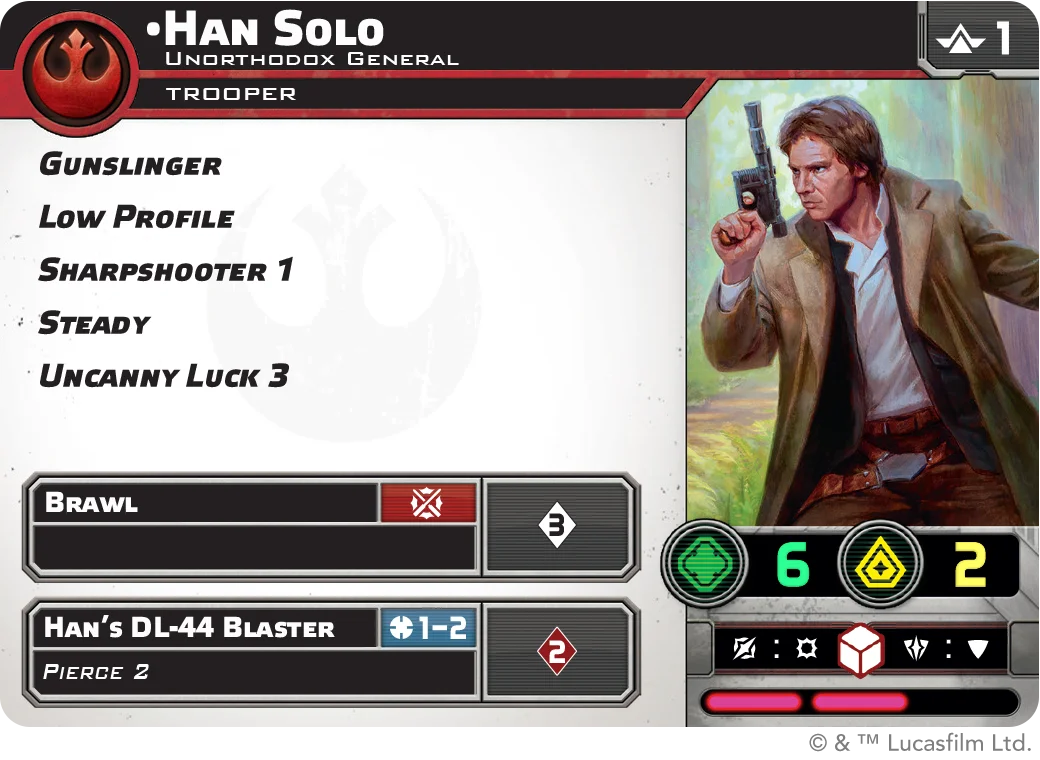 Han Solo, Unorthodox General represents the former-Captain Solo reluctantly assuming the burdens of leadership, heading Rebel strike teams against insurmountable odds. Han Solo is a capable gunslinger, most comfortable on your battlefields applying his Steady keyword to its fullest to deftly navigate Cover while sharpshooting Stormtroopers after a Move action. Low Profile and Uncanny Luck combine to create a deceptively resilient scoundrel, especially when a furry co-pilot is nearby to grant Backup and Guardian!