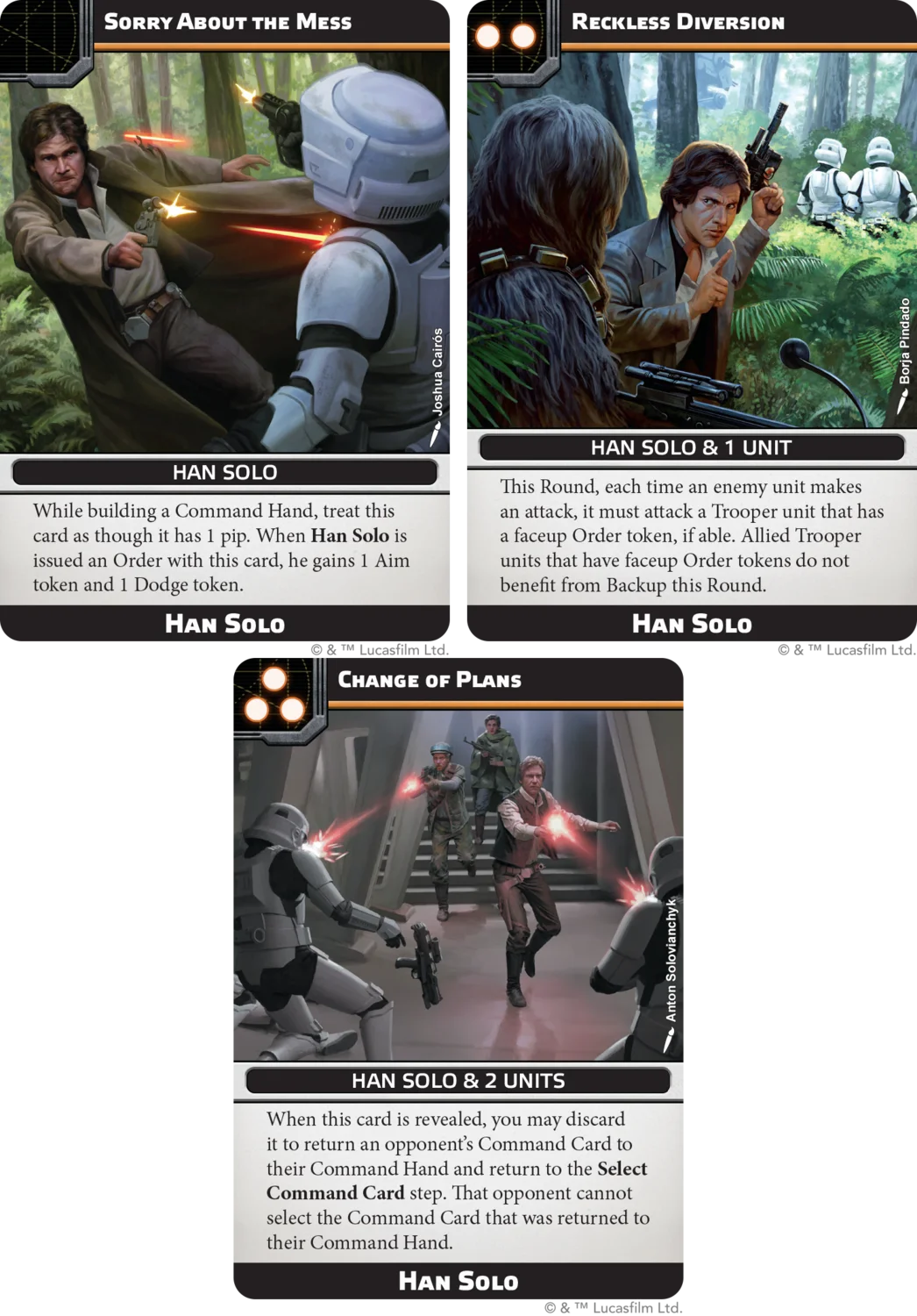Han Solo returns with his notoriously powerful suite of Command Cards as well. Sorry About the Mess has only 0 pips on it, virtually guaranteed to win priority on a pivotal round! Reckless Diversion can limit your opponents’ attack options on their turns, as brave or foolhardy units with a faceup Order token peel attention away from the rest of your army. Last but certainly not least, Change of Plans returns as one of the most infamous Command Cards in Star Wars: Legion, returning your opponent’s chosen Command Card back to their hand and forcing them to pick an alternative.