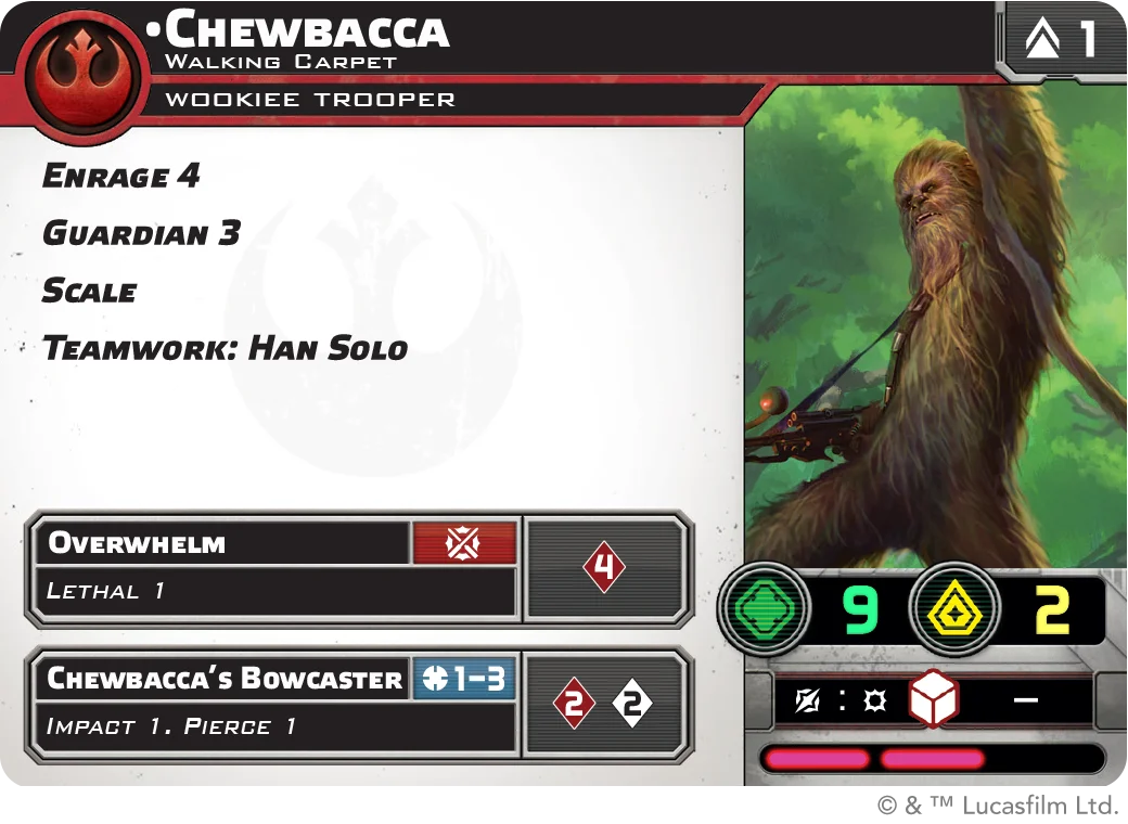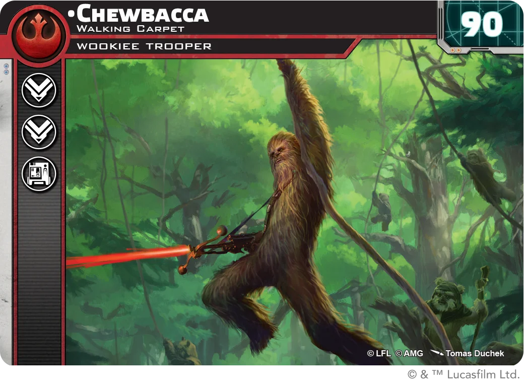 Chewbacca, Walking Carpet is a fiercely loyal companion to Han and his newfound family, not to mention a talented engineer, pilot, and combatant! His Guardian 4 keyword allows him to protect any friends of the Rebel Alliance nearby, but of particular note allows him to provide Backup to all of the characters described so far. He pairs naturally with Han in your army’s Commander role, thanks to the Teamwork: Han Solo keyword, which often doubles your returns on any actions or cards which may generate them Aim or Dodge tokens. If your opponent is unwise enough to upset him, Enrage 4 will grant Chewbacca Charge and a null Courage value: all the better to rip arms off with the Overwhelm attack!