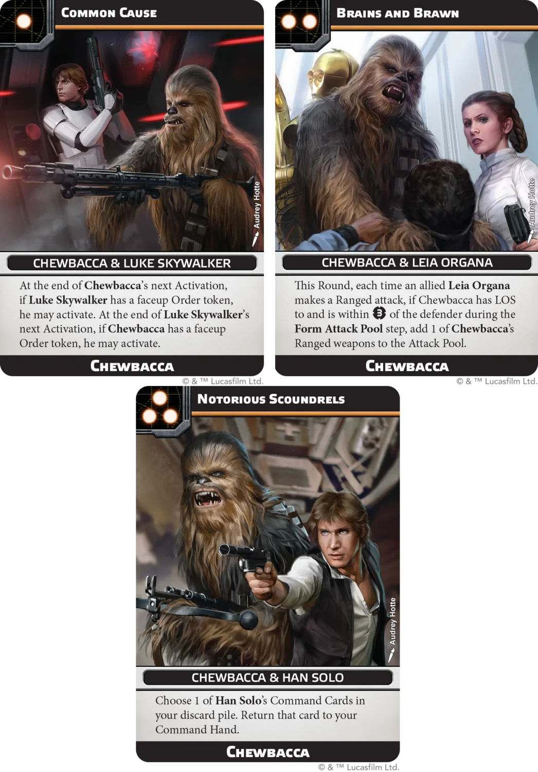 Chewbacca’s Command Hand is unique for its emphasis on Army Building and teamwork between him and his friends. Command Cause is a rare 1-pip that issues more than a single Order; in this case to both Luke and Chewbacca, allowing them to work in tandem at a crucial turning point of the game. Brains and Brawn allows Leia Organa to team up with Chewie to deliver a powerful combined Ranged attack. Notorious Scoundrels allows Chewbacca to return to hand any one of Han Solo’s discarded Command Cards; the only thing better than a Change of Plans is playing it a second time!