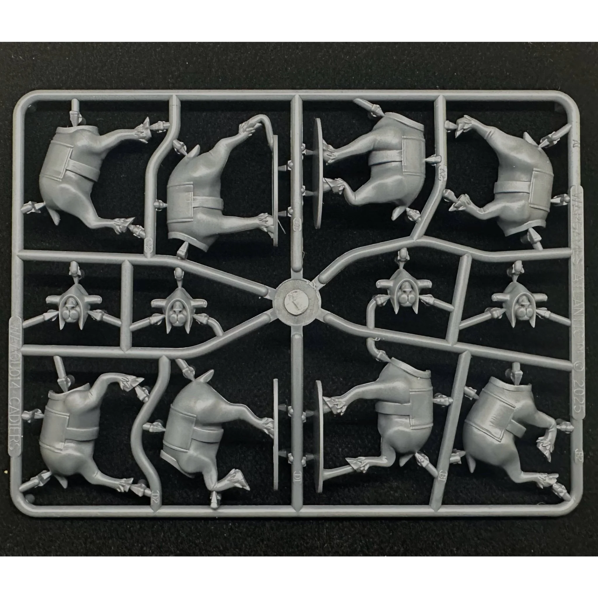 This hard-plastic box set includes enough parts to build a full Fidwog Command team, including officers, standard bearers, a signal Quar, and two pairs of two mounted rhyflers on Cadiers, along with two pack Cadiers. 12 dual-use 25mm bases and 6 25mm x 50mm pill bases are included.