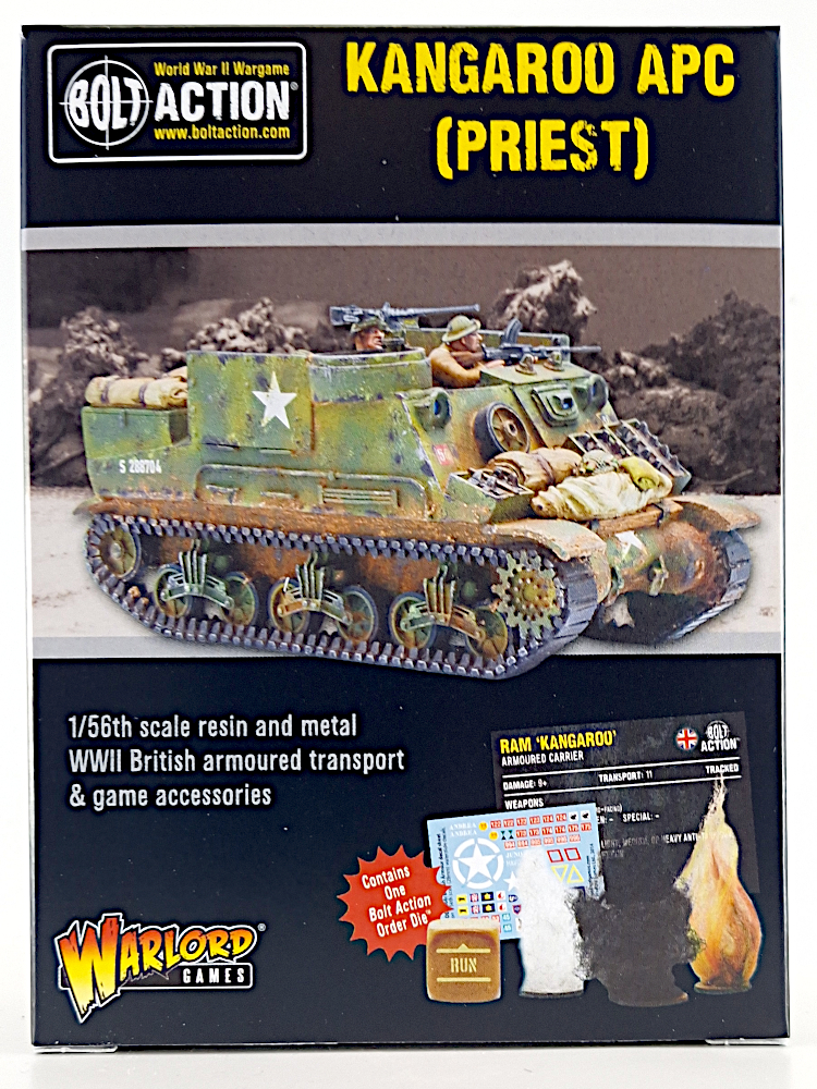 Der Bausatz enthält alle Teile um einen Kangarro APC auf Basis eines Priest zu bauen. Er besteht primär aus Resin und einigen Kleinteilen aus Metall. Zusätzlich sind Schadensmarker, ein Befehlswürfel, eine Profilkarte, ein kleiner Decalbogen und ein Zettel mit Hinweisen zum Arbeiten mit Resin enthalten.