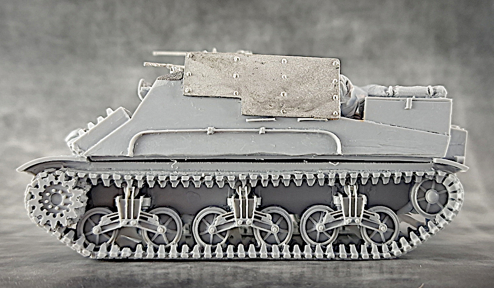 Der Zusammenbau geht flott von der Hand. Die zugehörigen „Anleitung“ finden wir auf der Packungsrückseite. Den Hauptteil bilden der zentrale Körper und die Ketten aus Resin. Dazukommen einige Anbauteile aus Metall wie zusätzliche Panzerplatten, eine Ringhalterung mit LGM sowie zwei Besatzungsmitglieder und die Köpfe zweier Passagiere die fest in das Resinmodell integriert sind. Bei den resinteilen ist der Säuberungsaufwand ein klein wenig höher als bei den Metallkomponenten. Außerdem sind auch einige sehr kleine Teile enthalten, die man bestimmt nicht mehr wieder findet, sollten sie beim basteln vom Tisch fallen. Mit ein klein wenig Vorsicht hat man aber sehr schnell ein schickes Modell vor sich stehen. Die Passgenauigkeit der Metallteile ist sehr gut, bei den Ketten ist diese immer noch in Ordnung, auch wenn teils kleinere Spalten entstehen. Diese werden aber auch zum Teil verdeckt, so dass sie nicht auffallen.