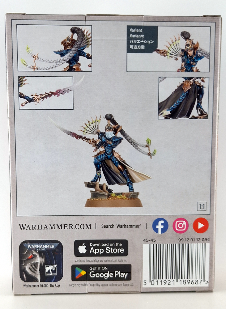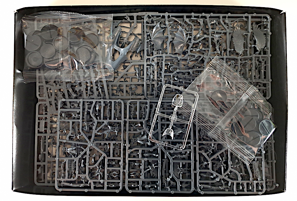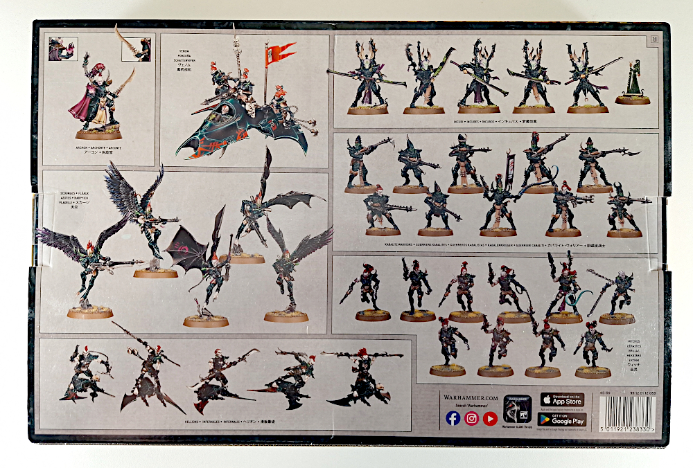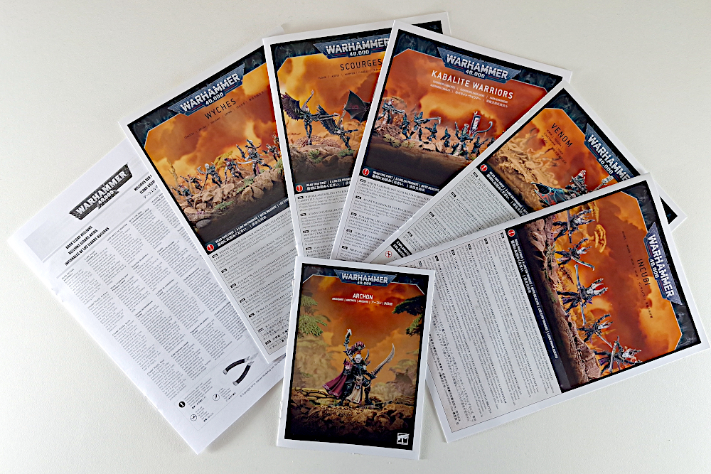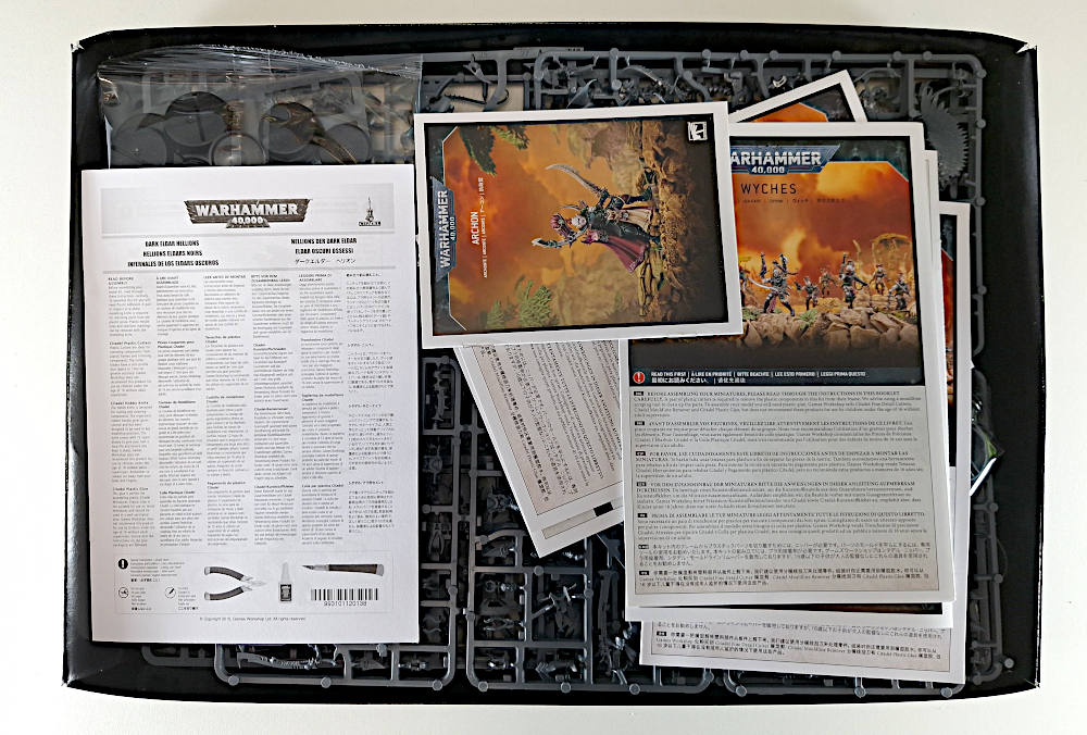 Die Box ist zunächst einmal erstaunlich kompakt. Immerhin sollen da 37 Miniaturen (Nein, der Autor dieser Zeilen weigert sich diesen depperten, einteiligen Incubi-Schrein als Miniatur zu werten. Das ist ein Marker. Egal ob das nun Aeldari-Aspektkrieger sind oder ihre düsteren Verwandten. Zumal das depperte Ding meisten keine Spieltechnische Relevanz hat.) drin sein. Davon sogar ein Fahrzeug. Aber, sobald man den Deckel öffnet merkt man: Die Box ist zwar bis zur Oberkante gefüllt, aber ja, es hat alles Platz drin. Damit sind übrigens auch die ganzen Bauanleitungen gemeint. Eine davon zeugt sogar von längst vergessenen Zeiten in reinem Schwarz-weiß-Druck. Wirklich neu ist lediglich der Archon, Um den soll es auch im weiteren Verlauf gehen.