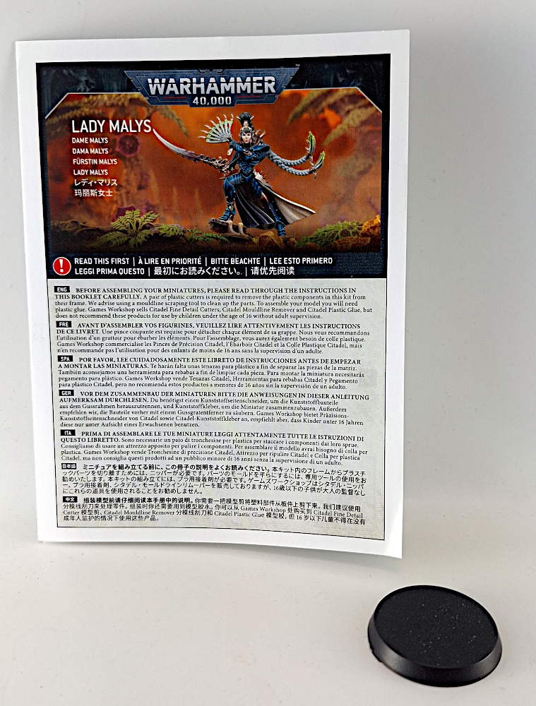 Fürstin Malys kommt in einem kleinen Charaktergussrahmen mitsamt einer Bauanleitung und einer 32mm Base.