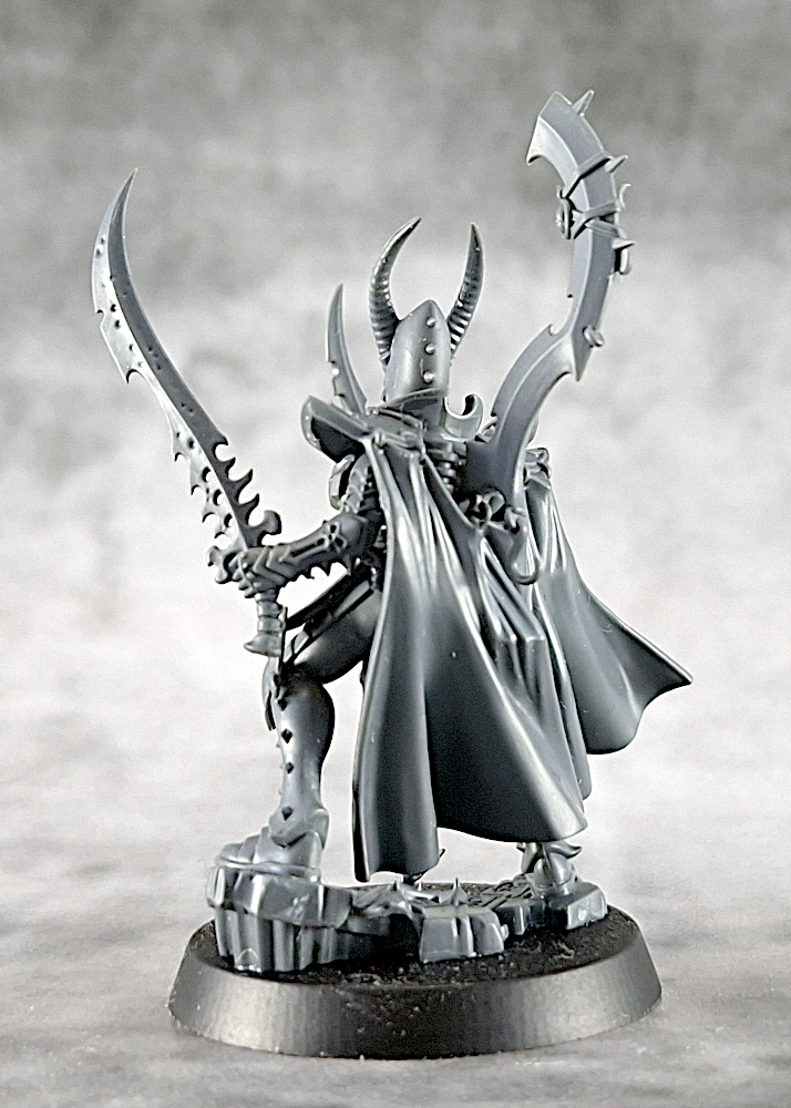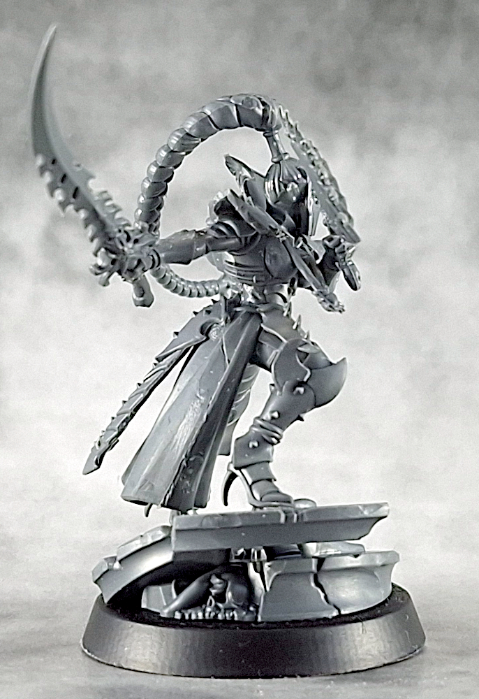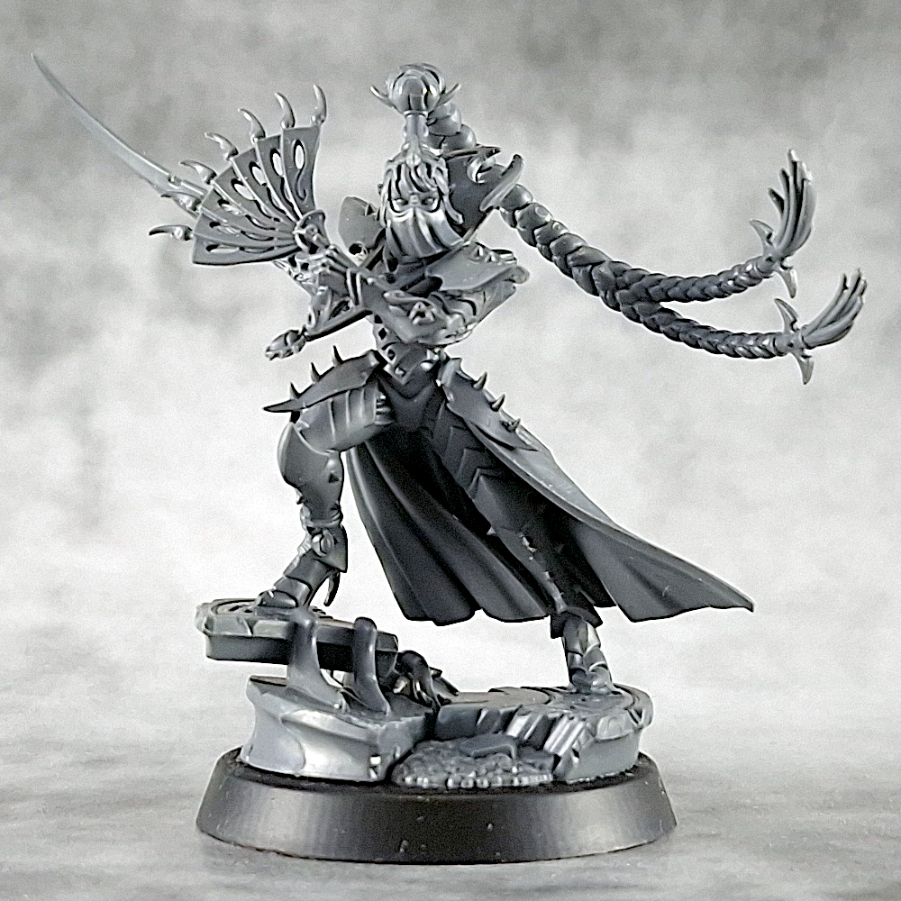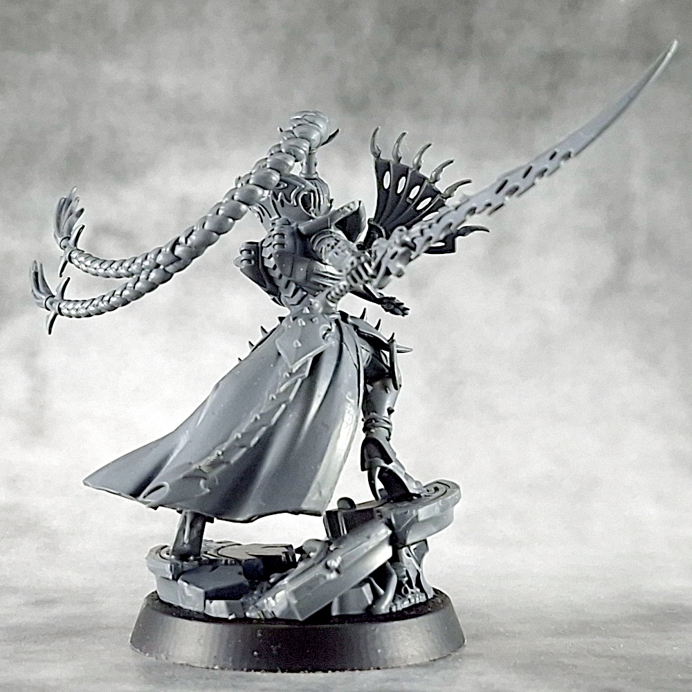 Das Auffälligste an Fürstin Malys ist sicherlich der Preis. Als schlanke Drukhari wirkt sie, trotz hohem Stockmaß und massivem Tactical Rock, vor allem verglichen mit den Space Marine Charakteren die wir vor kurzem in einer anderen Review hatten deutlich weniger massig und, nun ja, schlichtweg weniger fürs gleiche Geld (Sobald bei den Space Marines die Preiserhöhung zuschlägt. Bis dahin kostet sie sogar 3 Euro mehr.). Tatsächlich bevorzugt die Dame auch ansonsten einen eher sparsamen Look. Ihre Rüstung hat zwar hie und da etwas Zierrat, aber verglichen mit den Kabalenkriegern und Incubi gibt sie sich eher Bescheiden. Das gibt ihr das Aussehen einer eher praktisch veranlagten Anführerin, die sich durchaus an die Frontline begibt und nicht in Prunk und Pomp aus der hintersten Reihe kommandiert. Da wo es sicher ist.
