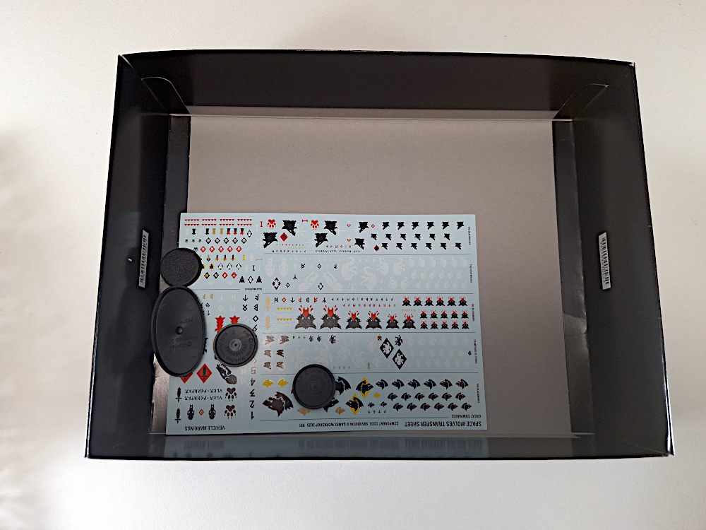 Die Plastikgussrahmen und ein paar erste Bases begrüßen uns sobald wir die Box öffnen. Darunter befindet sich eine Mappe aus Pappe in der ganzen Printmaterialen enthalten sind. Das Sieht schick aus und schützt Marker, Buch und Karten. Darunter finden wir dann die restlichen Bases, die Flugstäbe und die Decal-Bögen.