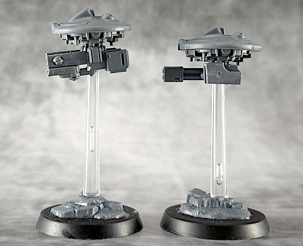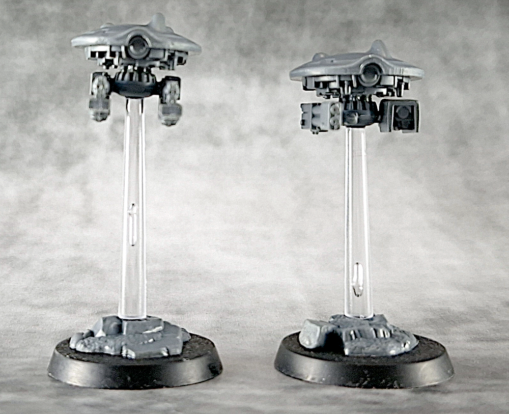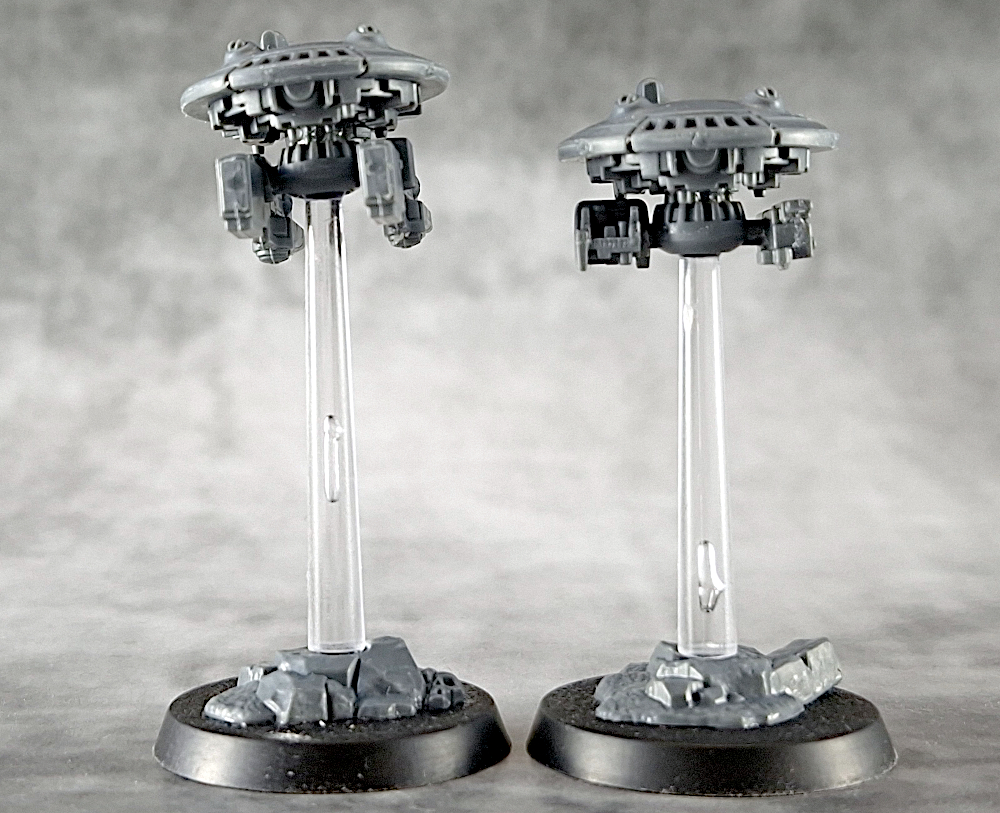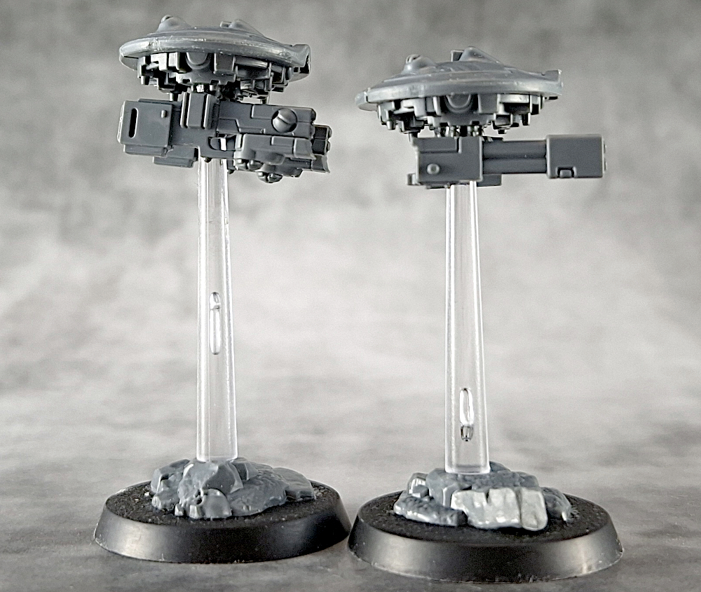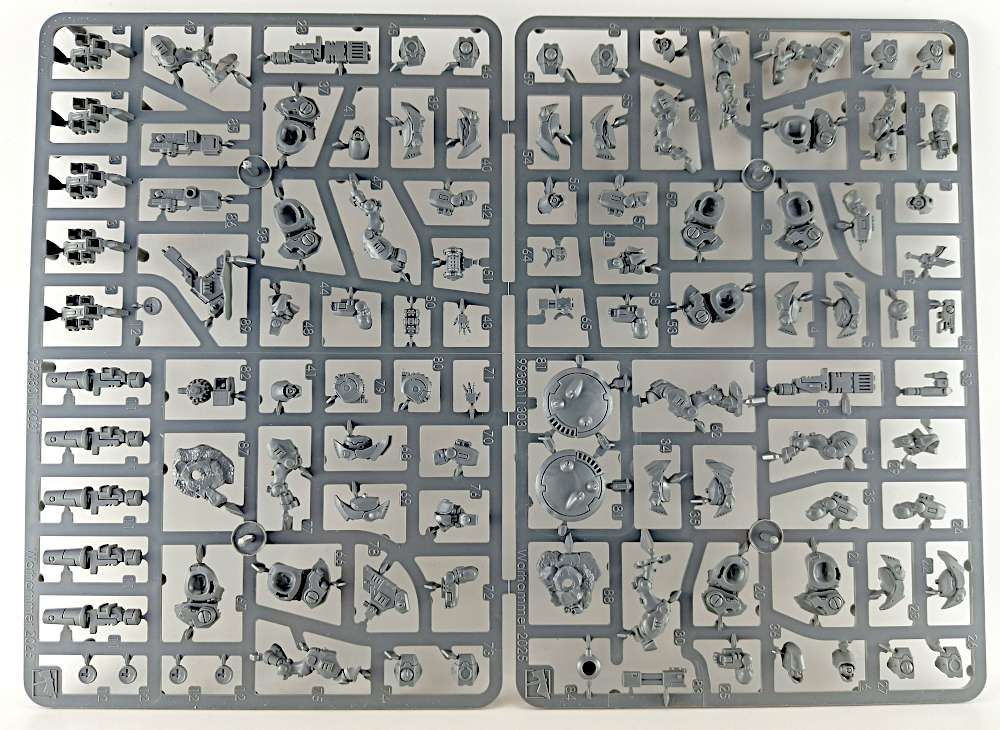 Die neue Variante der Geist Tarnanzüge erhöht den Zähler um eins von 25 auf 26. Das Team ist fünf T’au groß und bringt zwei Drohnen zur Unterstützung mit. Verteilt ist das ganze auf zwei großen Gussrahmen. Dazu kommen fünf 32mm Bases sowie drei 28(,5?)mm Bases für die beiden Drohnen und den Signalgeber. Der Zusammenbau war unerwartet langwierig, die die Modelle deutlich kleinteiliger sind als die Wolf Scouts. Während des Baus dürfen wir immer zwischen einem Spezialisten oder dem normalen Infiltrator auswählen. Bei den beiden Drohnen gibt es keine Optionen. Gerade die Köpfe (oder sollte man besser sagen der Teil mit dem Visier) sind etwas eigenwillig mit dem Gussrahmen verbunden. Manchmal ist der Anguß vergleichsweise groß und gerade wenn er seitlich platziert ist ist das herausknipsen des Teils eine kleine Herausfoderung. Bei einigen unserer Reviewmodelle kann man hier Stressmarks erkennen. Die Unterschiede bei den Spezialisten beschränken sich im wesentlichen darauf, was das Modell in der linken Hand trägt und vielleicht noch ein oder zwei Ausrüstungsteile an der Hüfte oder dem Rückenmodul. Größere optische Unterschiede wie z.B. ein anders geformter Helm oder andere Linsen sind nicht vorhanden.