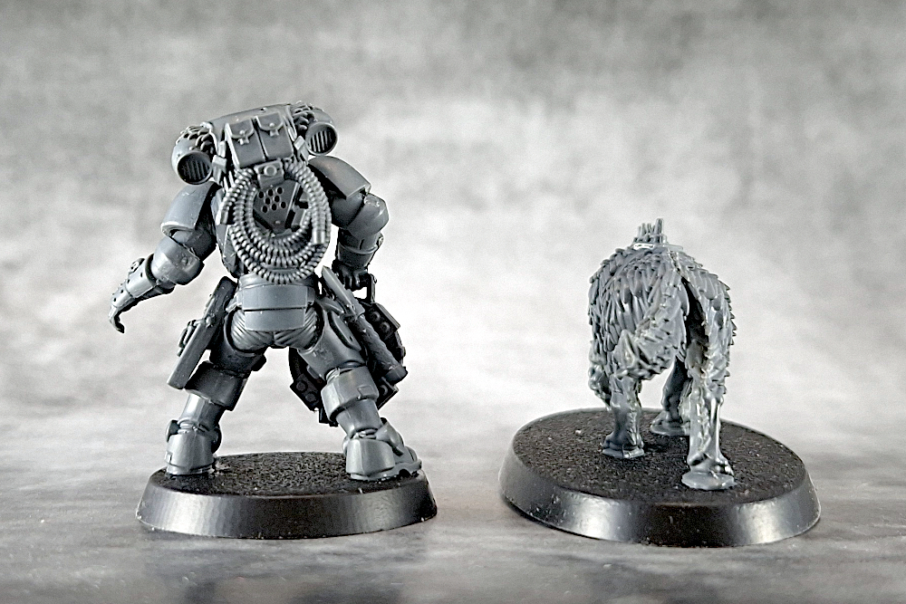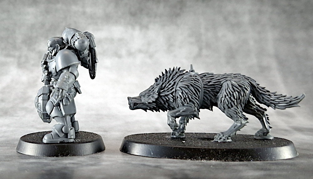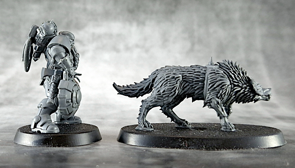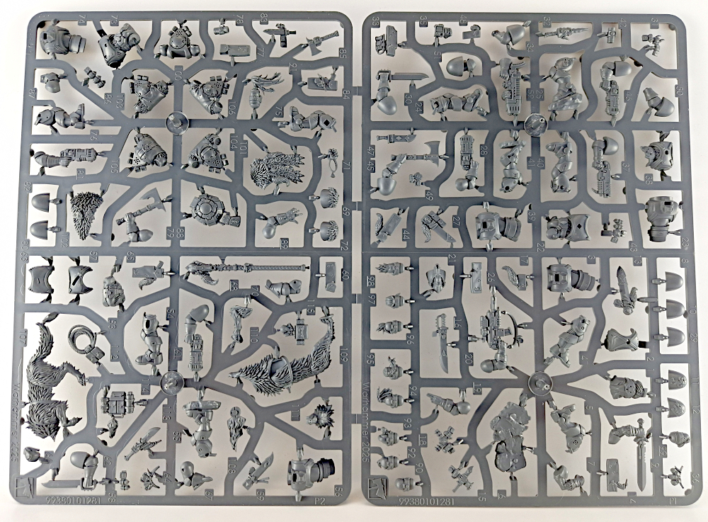 Die Space Wolves bekommen ihren persönlichen Scout-Bausatz aus dem sich fünf Scouts und ein Fenriswolf bauen lassen. Auch hier sind die Einzelteile auf zwei große Gussrahmen verteilt. Die Scouts nutzen die bekannte 32mm Base, der Fenriswolf erhält ein Ovalbase von 60mm Länge. Die Scouts der Space Wolves haben eine Sonderstellung. Da ihre Gensaat die Space Wolves eher zu wildem, übermütigen Verhalten verleitet sind junge Space Wolves nicht sonderlich geeignet für die delikaten Aufgaben wie Aufklärung oder Sabotage, welche normalerweise ins Resort der Scouts fallen. Erst mit dem nötigen Alter kommen Weisheit und Zurückhaltung. Also, davon ausgehend dass sie ihr ungestümes Verhalten lange genug überleben. Daher ist die Idee eigentlich nicht schlecht das Space Wolves statt der üblichen Scout-Rüstung die neue Phobos-Rüstung tragen. Insgesamt sind sechs unterschiedliche Spezialisten möglich. Welche davon man ins ein Team aufnehmen möchte sollte man aber gut planen. So teilen sich Rudelführer und Frostauge bereits die erste Bauoption. Und damit nicht genug: Sie teilen sich außerdem die Rückenmodule mit Bauoption vier. Für den Rudelführer gibt es ein Rückenmodul mit einer Aussparung, in die ein Pelz geklebt wird. Für den Runenprister-Skalden wird exakt eben auch dieses Rückenmodul benötigt, darüber wird aber dann ein anderer Pelz gelegt. Und auch das Frostauge teilt sich das Rückenmodul mit der Jäger-Option des Runenpreister-Skalden. Fairerweise muss man sagen, dass einem die Bauanleitung darauf hinweist, dass die entsprechenden Teile nur einmal vorhanden sind. Das Warum zu ergründen bleibt allerdings uns überlassen und so kann es passieren, dass man sich selbst die Entscheidung ob Runenpriester-Skalde oder Jäger bereits abgenommen hat als man als erstes Modell den Rudelführer gebaut hat. Davon ab sind die Modelle schnell gebaut und gehen flott von der Hand.