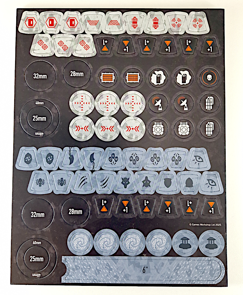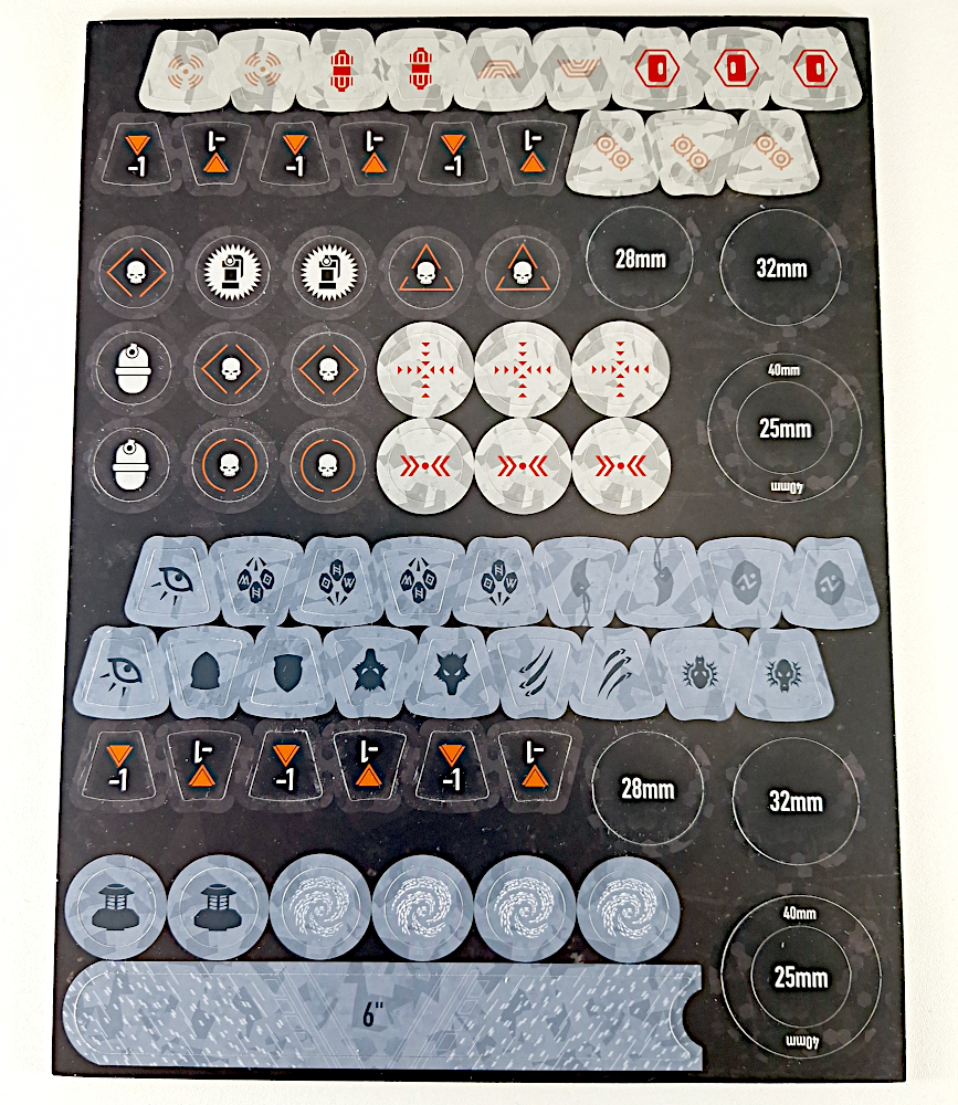 Behalte stets deine Fähigkeiten, Missionsziele, Ausrüstung und Punkte im Verlauf des Spiels im Blick, mit diesen zu den Teams passenden Markern. Der Bogen enthält 72x beidseitig bedruckte Kartonmarker, 38x für das XV26-Geist-Kampfanzug-Kill-Team und 34x für das Wolfscouts-Kill-Team.