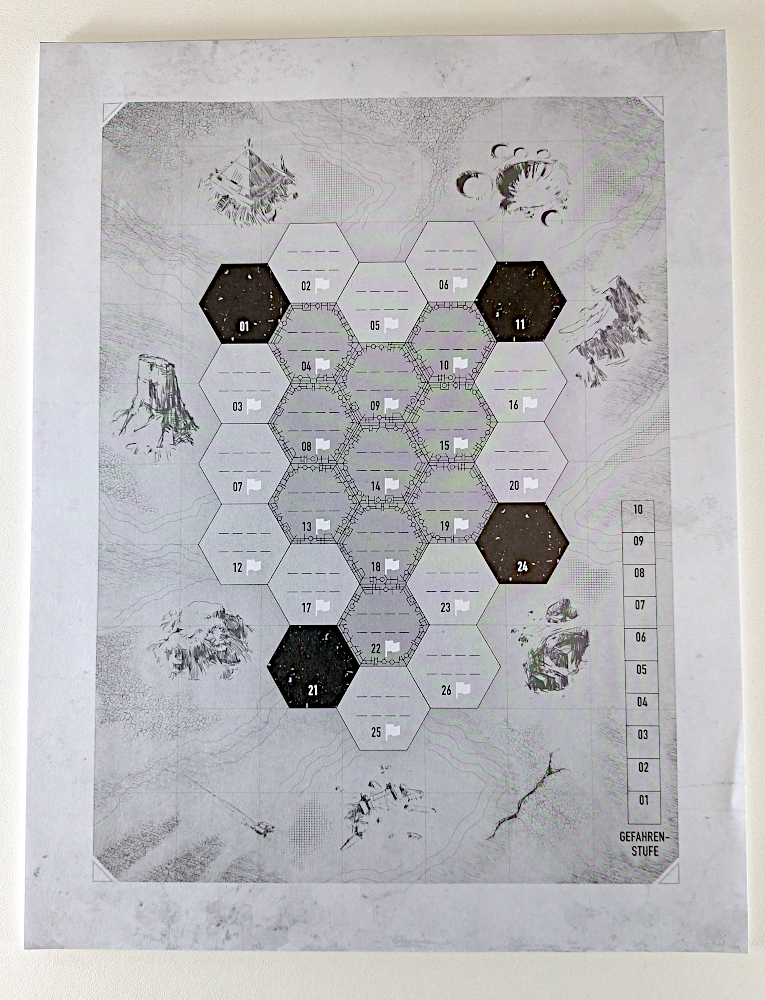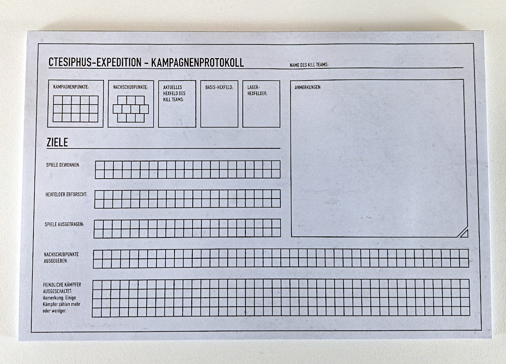 Bei den Kampagnenkarten und dem Kampagnenprotokoll handelt es sich jeweils um einen Abreißblock. Während die Blätter des Kampagnenprotokolls immer dieselben sind enthält der Kartenblock immer 5 unterschiedliche Karten die sich wiederholen. Die Karten sind auch im Buch auf den letzten Seiten abgedruckt. Das Protokoll im Fließtext und daher deutlich kleiner. Es empfiehlt sich also nicht die letzten Seiten der Blöcke aufzubrauchen (vor allem nicht die Protokolle) sondern hier lieber mit Kopien zu arbeiten.