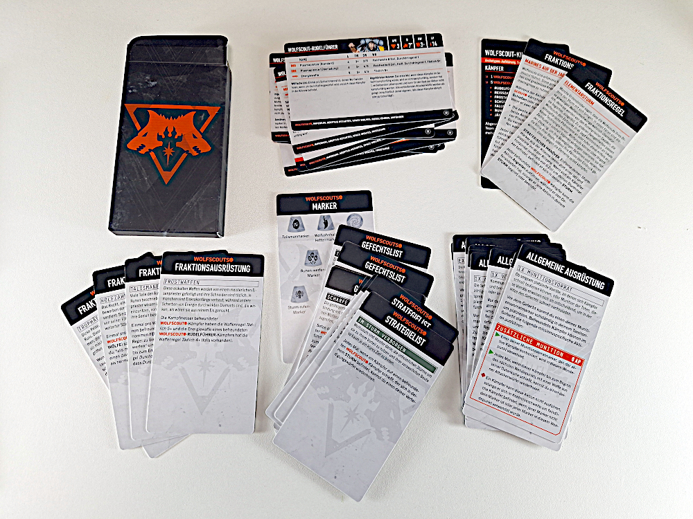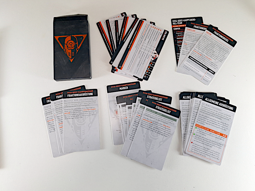 34x Datenblattkarten für die Kämpfer, Fraktionsregeln, Listen, die Fraktionsausrüstung, allgemeine Ausrüstung und noch mehr.