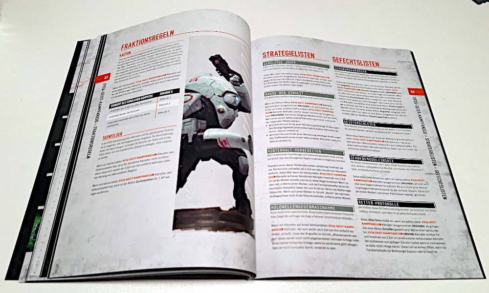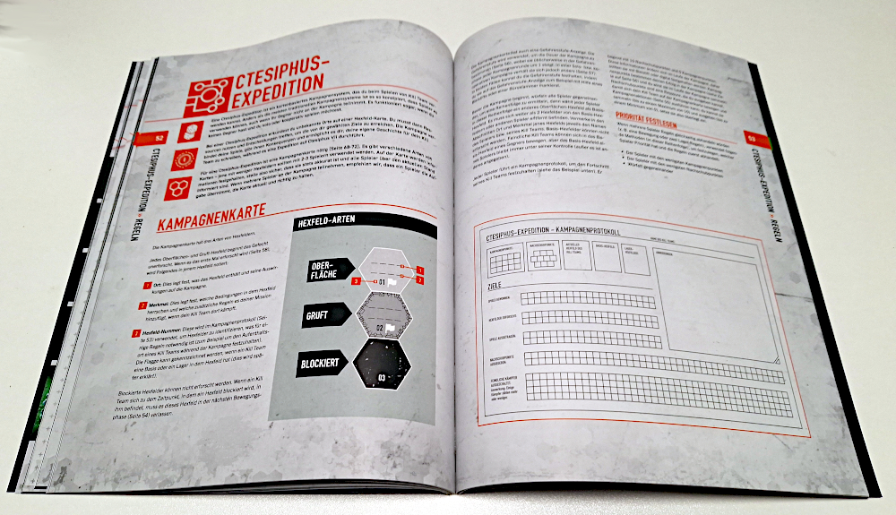Das Dosier beinhaltet noch einmal alle Spielwerte und Regeln der beiden Teams sowie Informationen zu deren Hintergrund. Dazu kommen neben einer Bildergalerie die Kampagnenregeln.