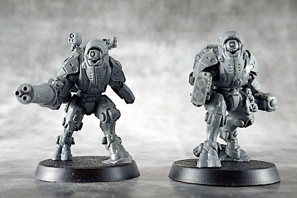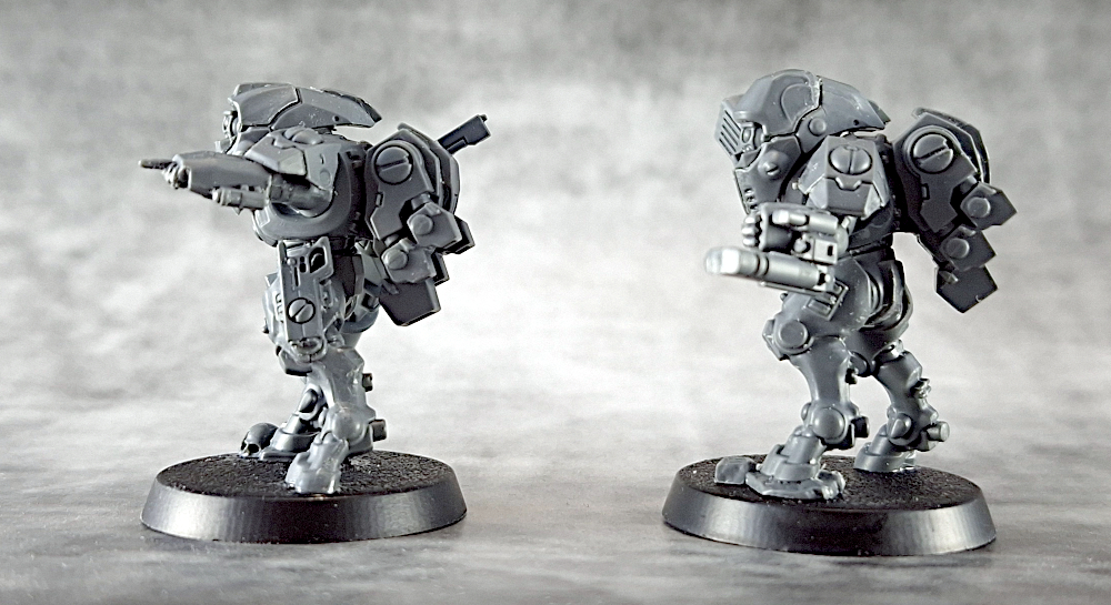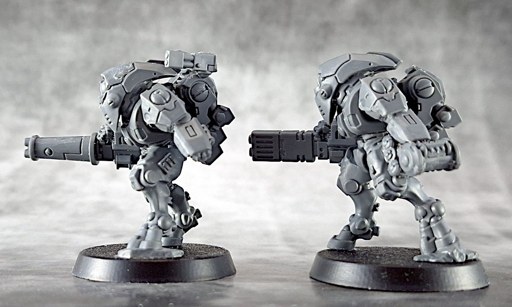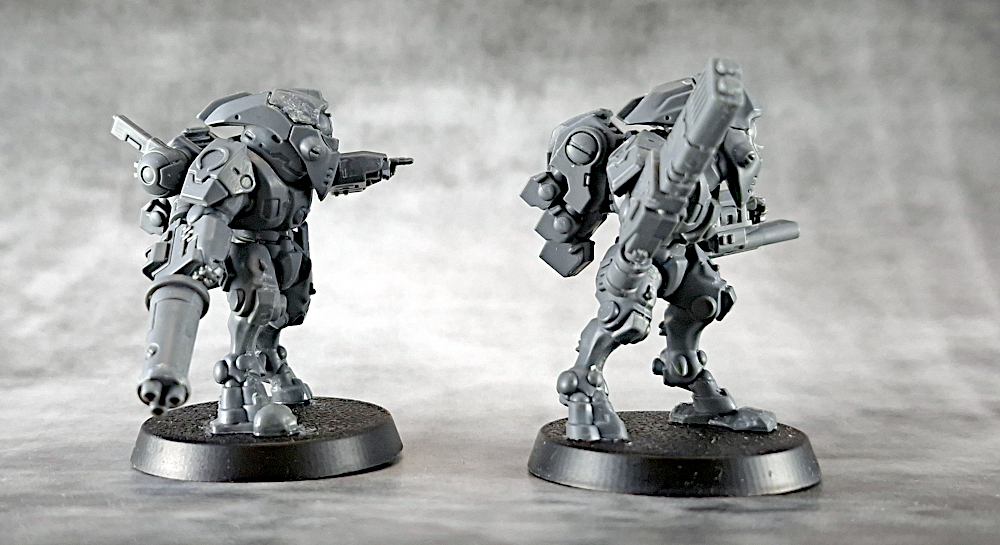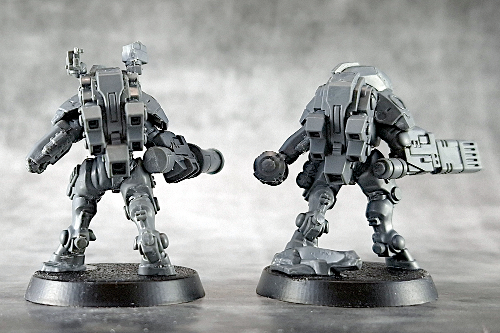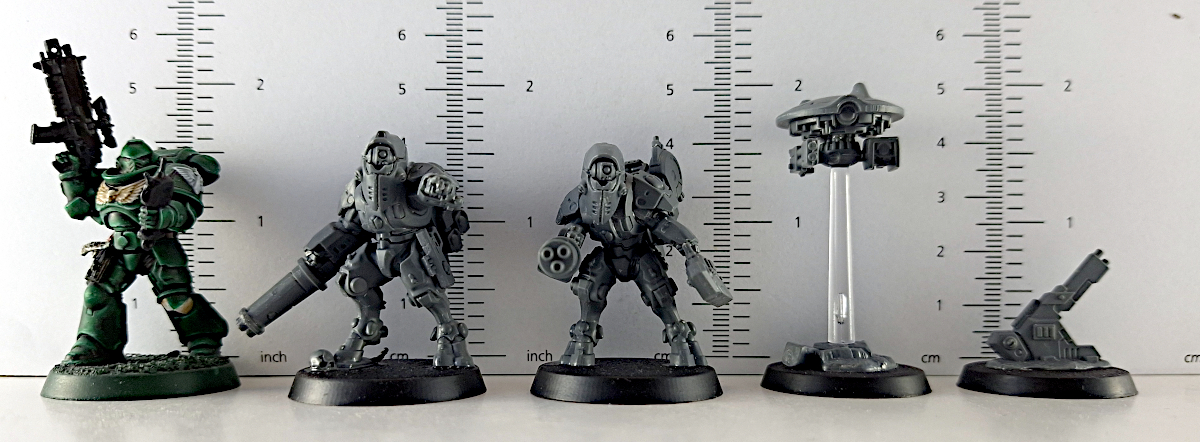 • Oha. Hatte erwartet, die Tau-Anzüge seien größer. So wirken sie sogar relativ „normal“ proportioniert. Mag aber auch nur neben den Space Sigmarines so erscheinen.