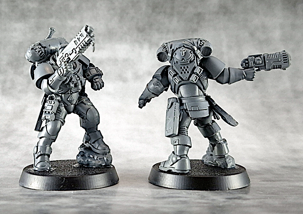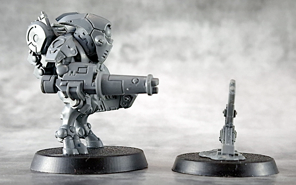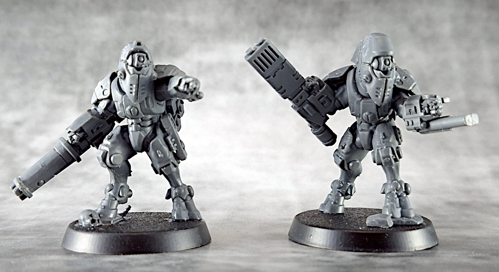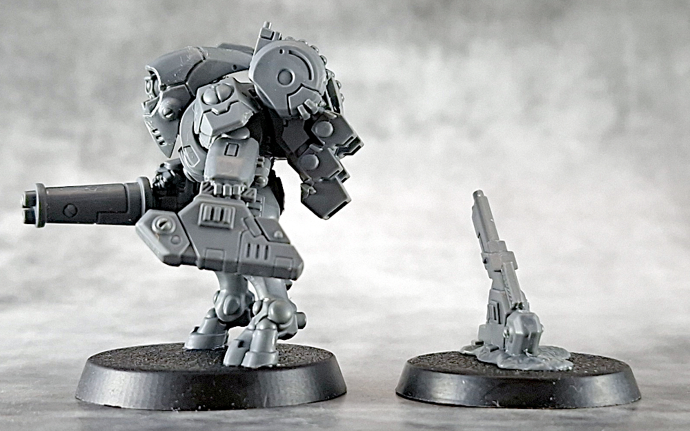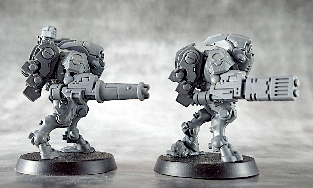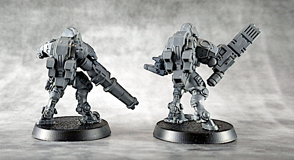 • Oha. Hatte erwartet, die Tau-Anzüge seien größer. So wirken sie sogar relativ „normal“ proportioniert. Mag aber auch nur neben den Space Sigmarines so erscheinen.