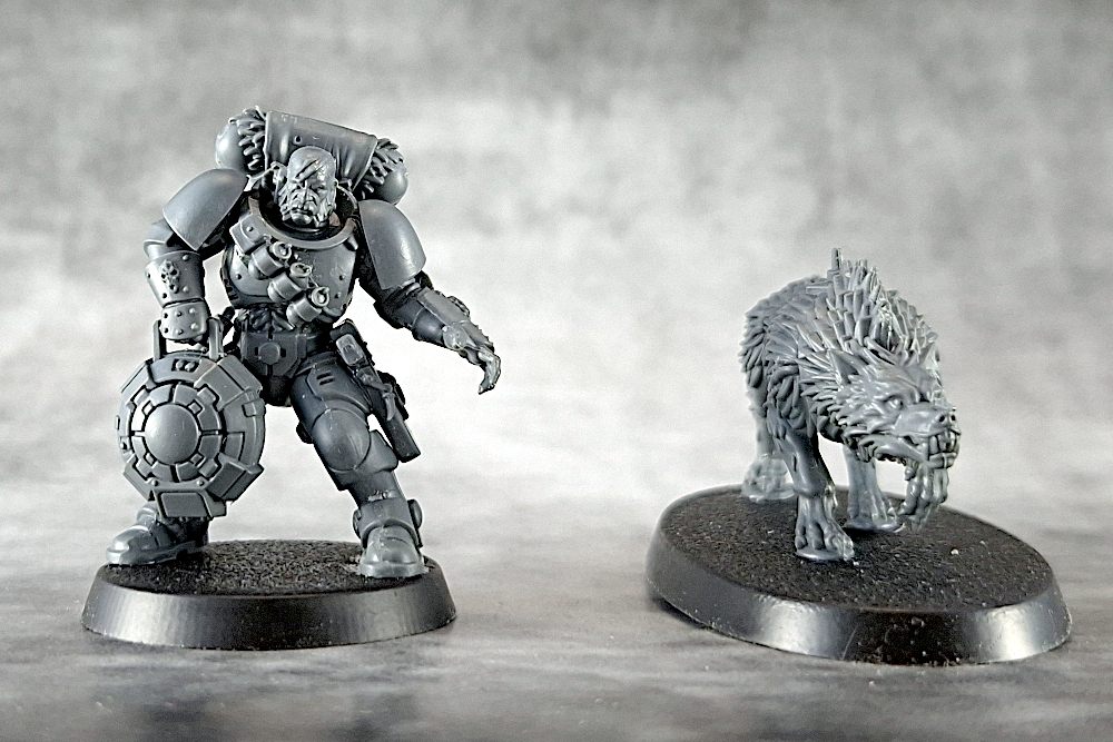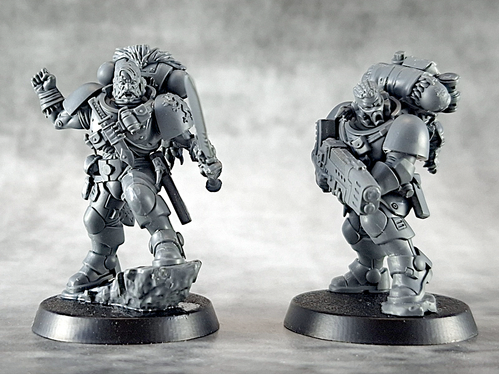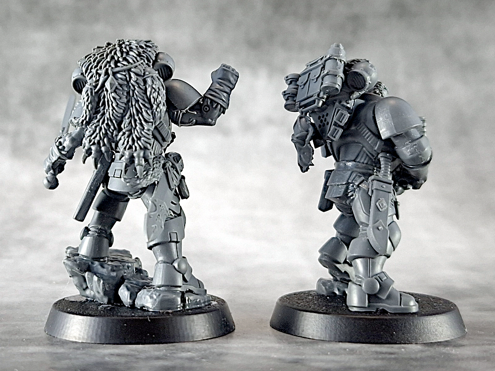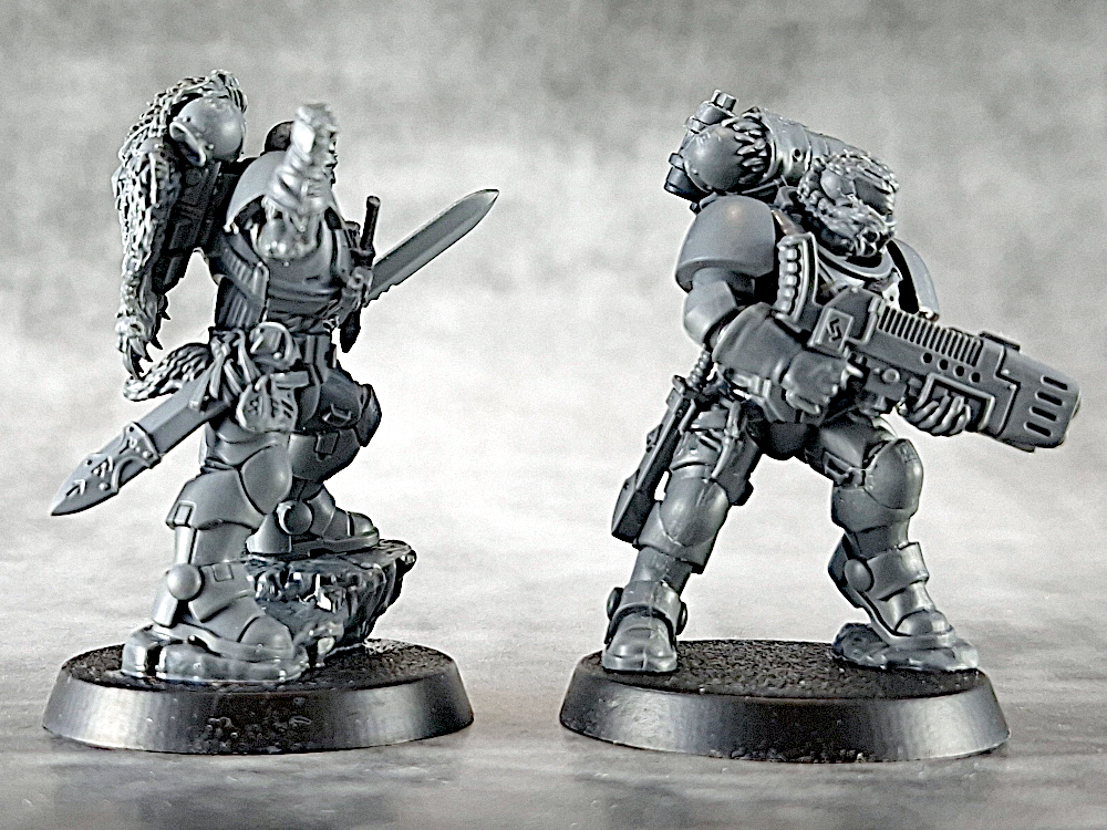 Wie so oft in letzter Zeit nutzt Games Workshop auch diese Kill Team Box um zwei neue Einheiten für Warhammer 40.000 auf den Markt zu bringen. Die Space Wolves erhalten also ihren eigenen Scout-Bausatz und die T’au überarbeitete Geister. Leider hatte ich keinen XV25 zur Hand, aber über Google lassen sich recht einfach Vergleichsbilder finden (meine gewählte Suche war „xv25 vs xv26 t’au“). Die neuen Geister sind ein klein wenig größer als ihre Kollegen, aber auch schlanker. Auch die Waffen wurden etwas geschrumpft. Dafür wirken die XV26 agiler als die etwas klobigeren XV25. Und sie wirken detaillierter. Bei den Scouts handelt es sich um komplett neue Modelle, welche Elemente der frühen Metallmodelle übernehmen. So tragen die meisten Lederhandschuhe über ihrer Phobos-Rüstung, bewaffnet sind sie neben Boltpistolen und Kampfmessern auch mit Plasmapistolen und Äxten. Der Bausatz enthält keine Helmoptionen, dafür ist die Menge an Spezialteilen teilweise sehr hoch. Der Runenpriester-Skalde teilt sich mit seiner Option lediglich Beine und Rücken und die sehen noch dazu sehr generisch aus. Ich werde mal versuchen ob ich mit ein klein wenig Umbauarbeit an einem Reiver nicht doch noch einen Runenpriester-Skalden zusammen bekomme. Passend zu den anderen neuen Space Wolves Bausätzen enthält auch dieser Bausatz nur für eines der Modelle gestaltete Schulterpanzer und auch hier stehen dieselben beiden Großkompanien zur Auswahl: Ragnars Blackmanes und Logan Grimnars Champions von Fenris.