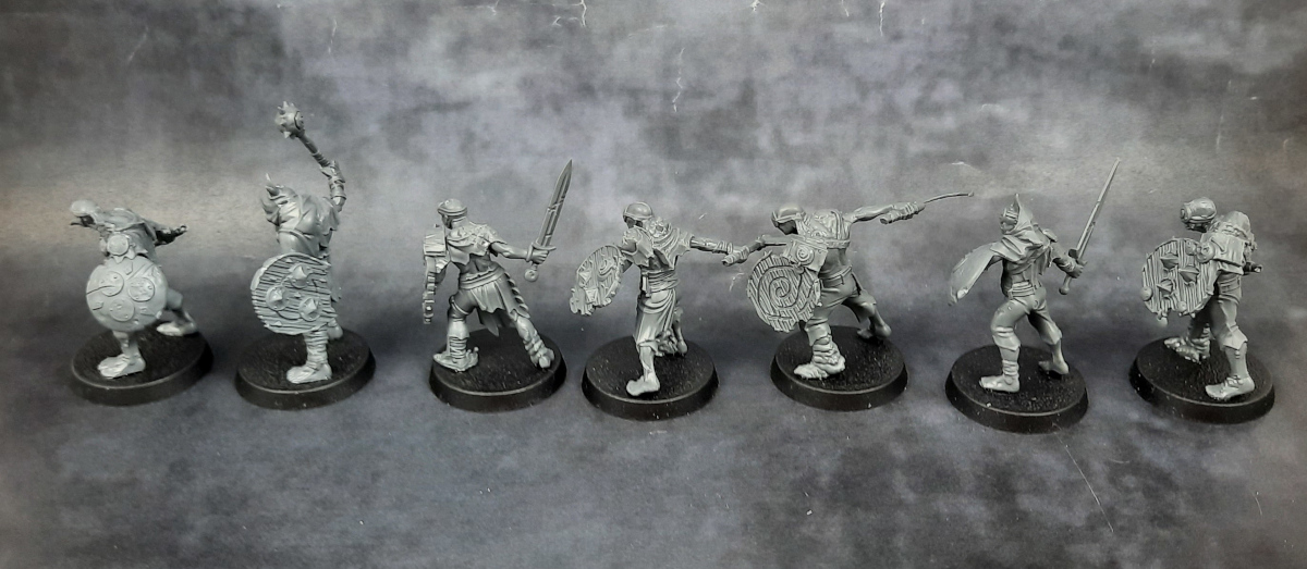 – 7x Heldenminiaturen und 1x Begleiter aus khakifarbenem Kunststoff: Edmark Valoran, Bren Tylis, Inara Sion, Drolf Eisenschädel, Kelthannor, Drasher Vorn und Jacobus Ranke mit Flüster