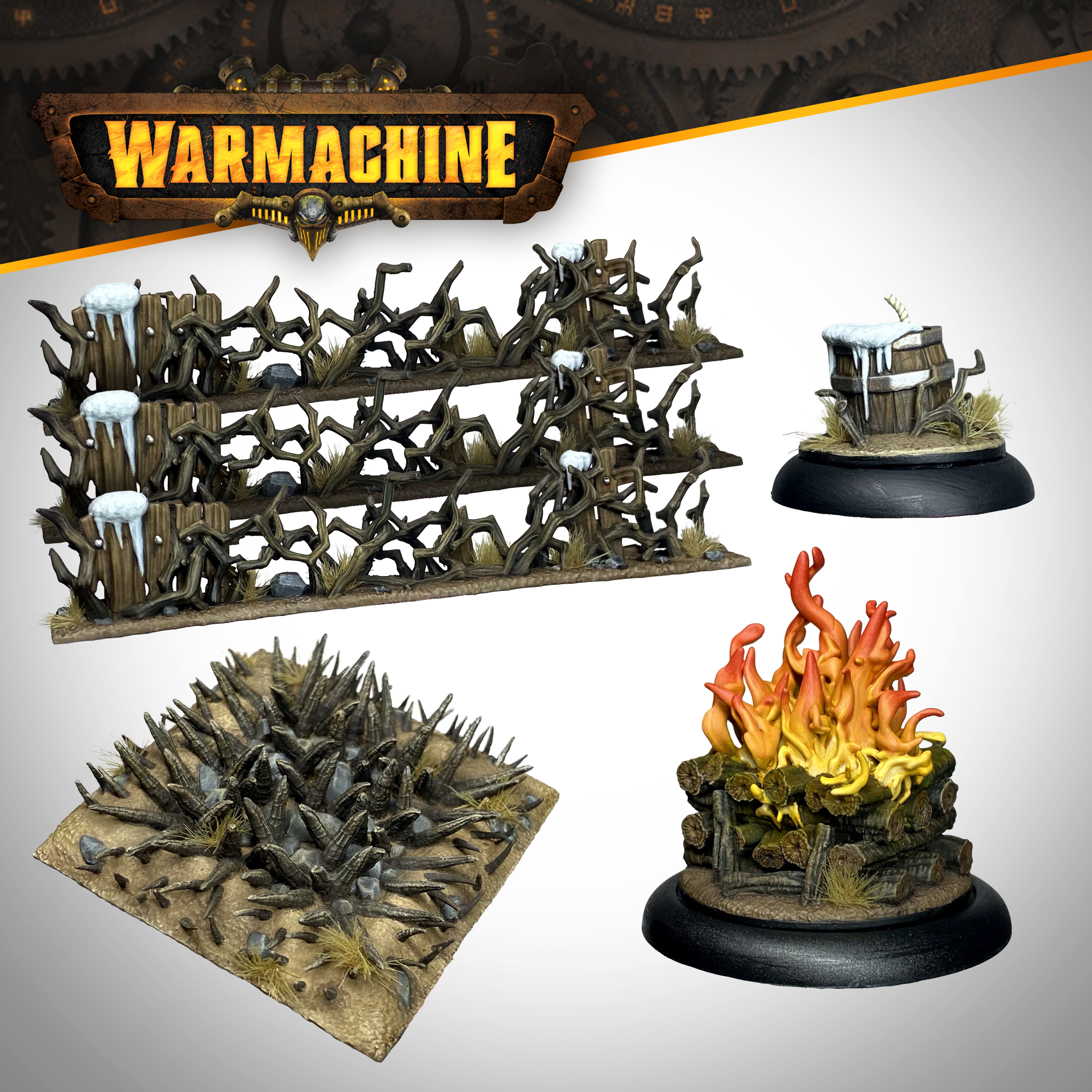 Theme your tables! Two new defense sets are now available on the Steamforged store. Got a 3D printer? Get them now from the Warmachine 3D store. These sets work with the Defenses command card, letting you place fortifications before deployment. They also double as characterful terrain pieces.