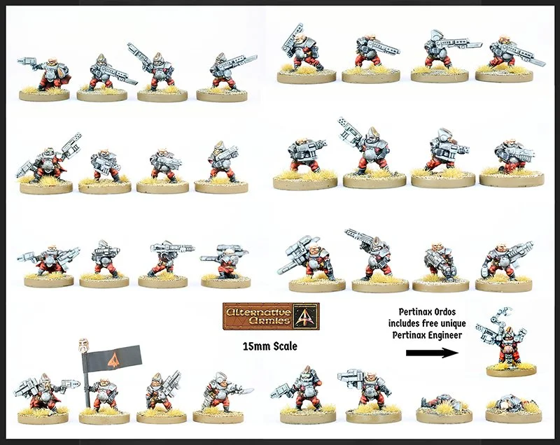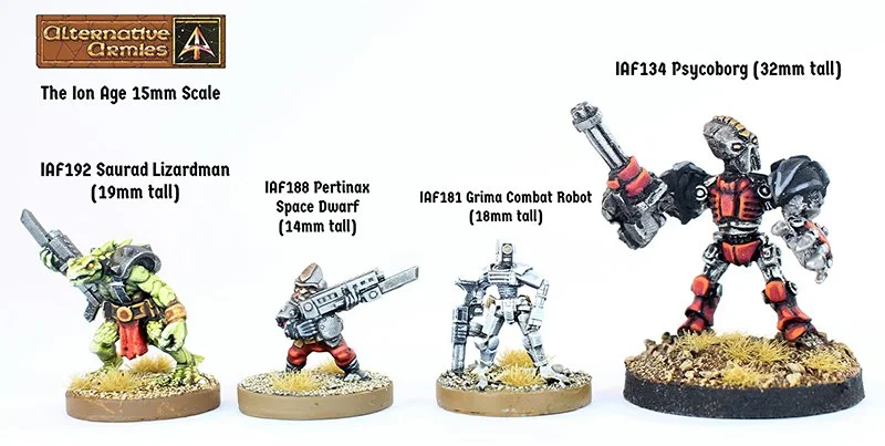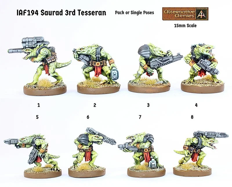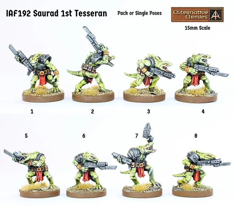 There are thirty three new 15mm poses. A Saurad is slightly taller than a Human but is much thicker limbed and stronger. Each is about 19mm standing. Four Pack codes (Pack or choose singles on that page) and a Platoon Pack with free extra unique Saurad Tracker kneeling with Sword.