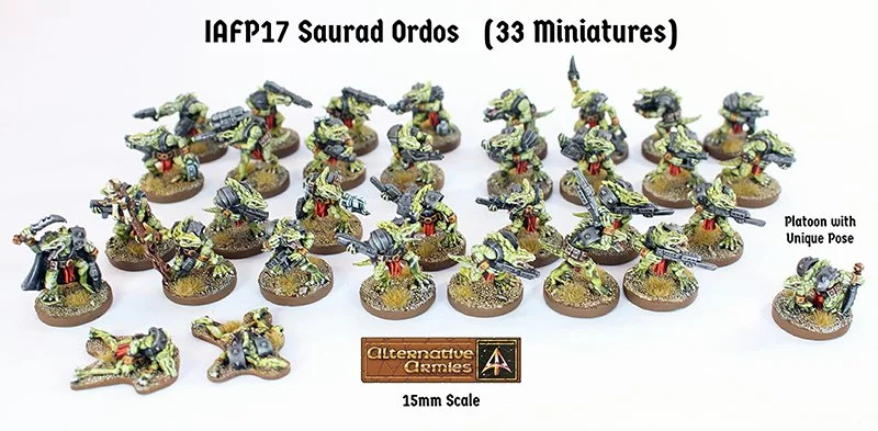 IAFP17 Saurad Ordos (Platoon Pack) – Includes free extra unique miniature! This code contains everything from IAF192, IAF193, IAF194 and IAF195 and the kneeling Saurad Tracker. You can also get the tracker on its own on that page.