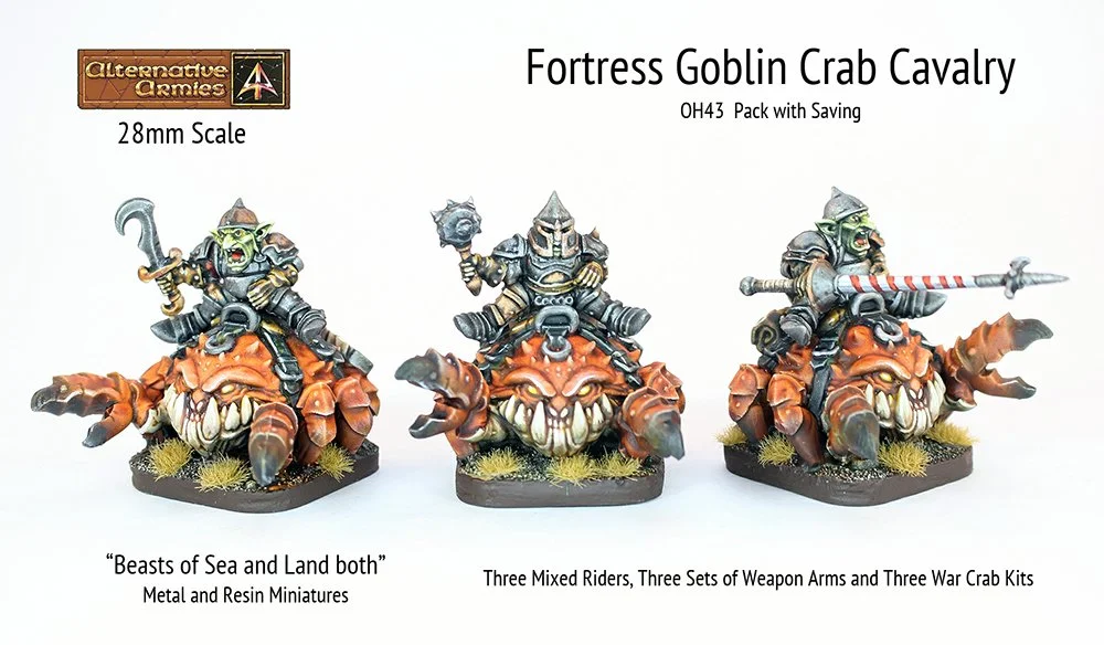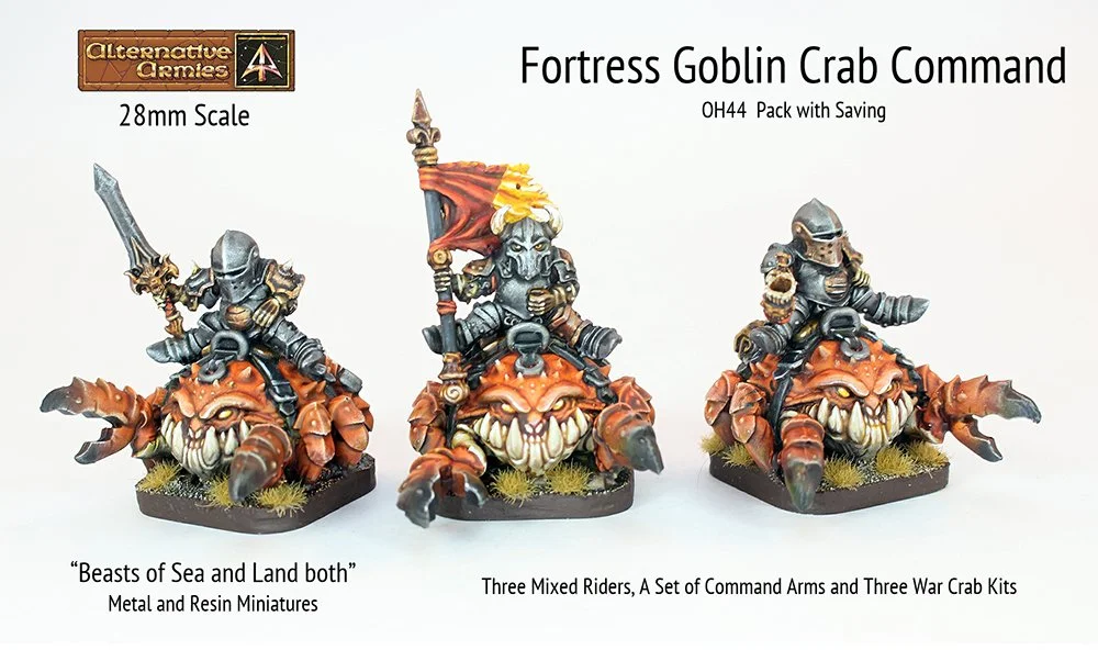 OH44 Goblin Crab Cavalry Command (Value Pack): This pack contains three multiple part 28mm cavalry miniatures these being three War Crabs and three riders. A mix of two different rider bodies along with a sprue of command arms these being a Sword, Banner (with Flag) and Horn. To lead your crab riding cavalry units.