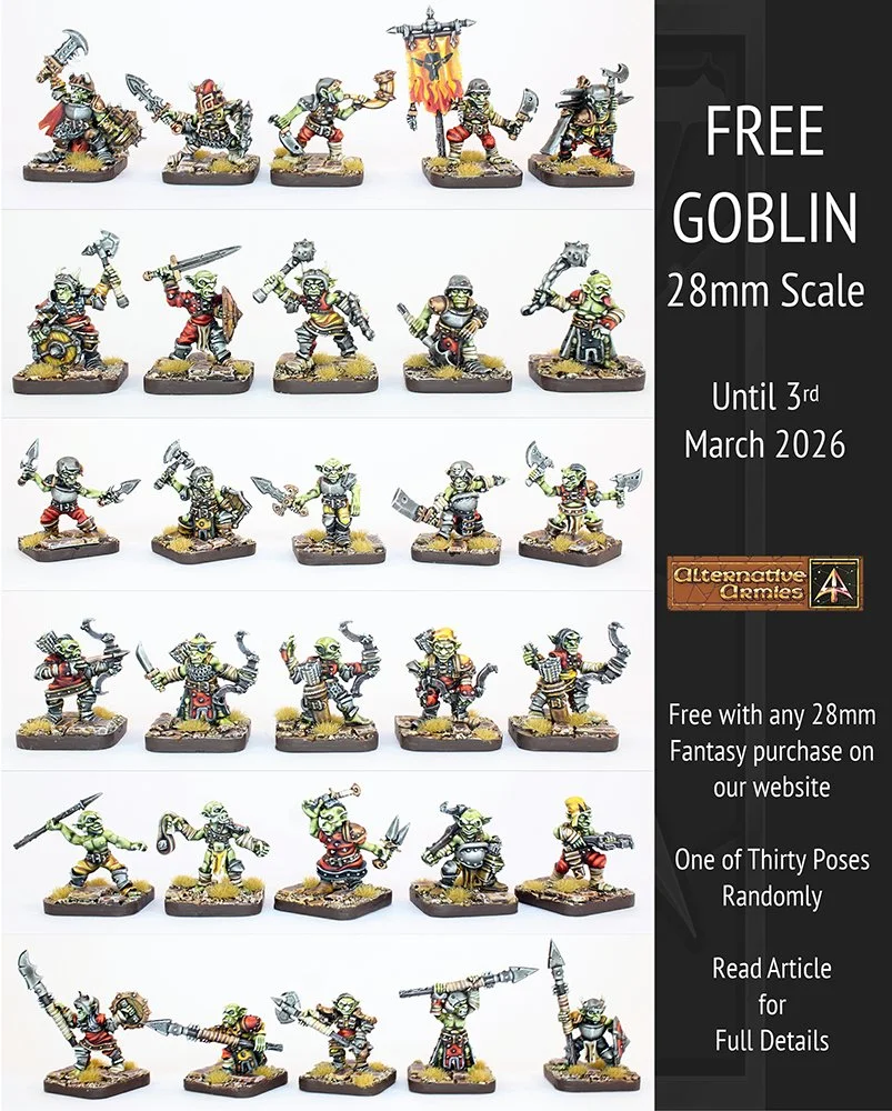 Until 3rd March 2026 any order placed which contains even a single Fantasy 28mm miniature will automatically get a random Fortress Goblin (worth 2.75GBP to 3.00GBP) chosen from 30 poses included. Any Alternative Armies, Asgard, Halcyon or other fantasy in this scale will get you the freebie.