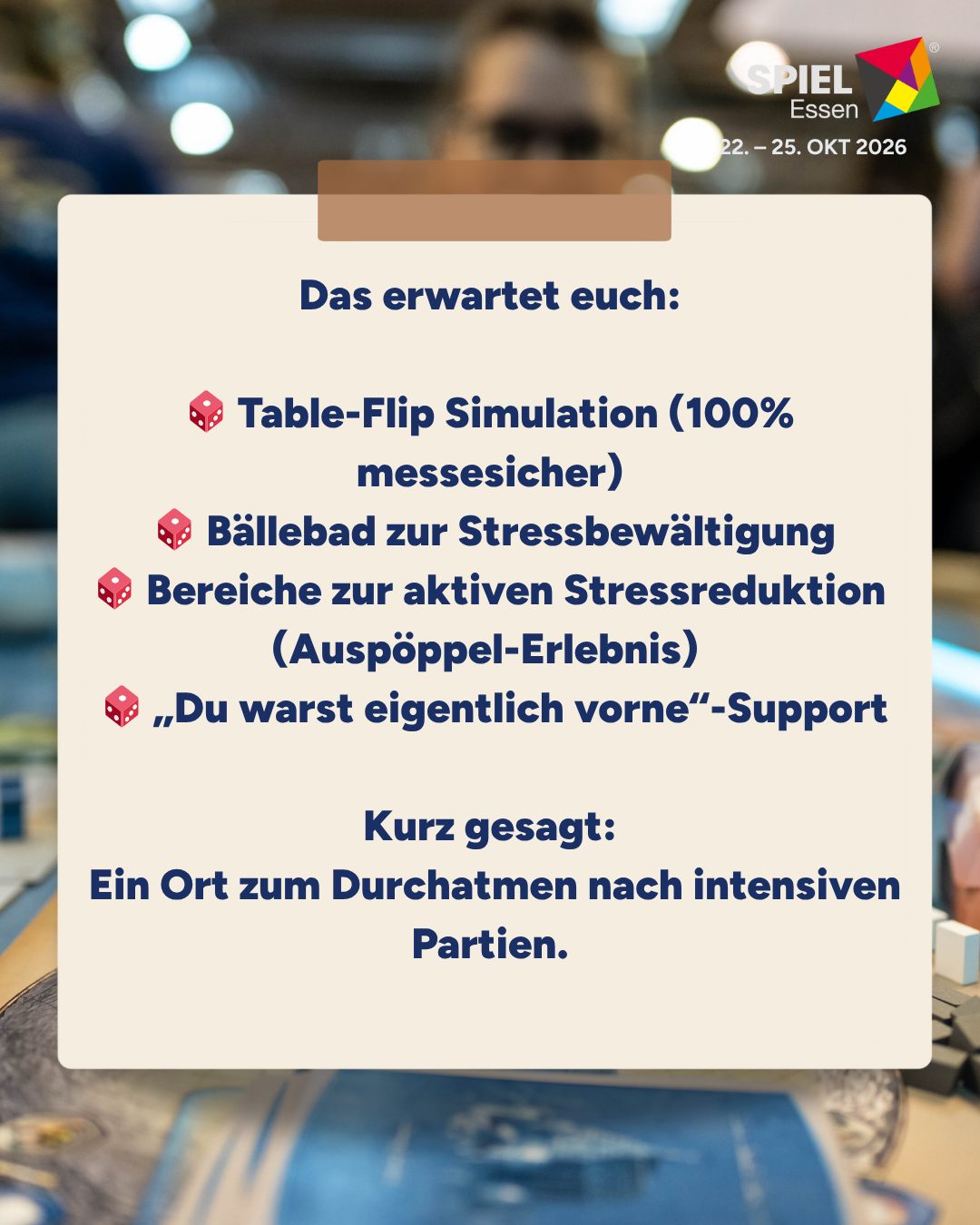 Ein Bereich, den wir in diesem Rahmen erstmals testen, ist eine Abreagier-Area für schlechte Verlierer.Gerade nach knappen Niederlagen oder längeren Partien kann es helfen, sich kurz zurückzuziehen, durchzuatmen und den Kopf wieder freizubekommen – um danach mit neuer Energie in die nächste Runde zu starten.Dafür stellen wir unter anderem folgende Angebote bereit: