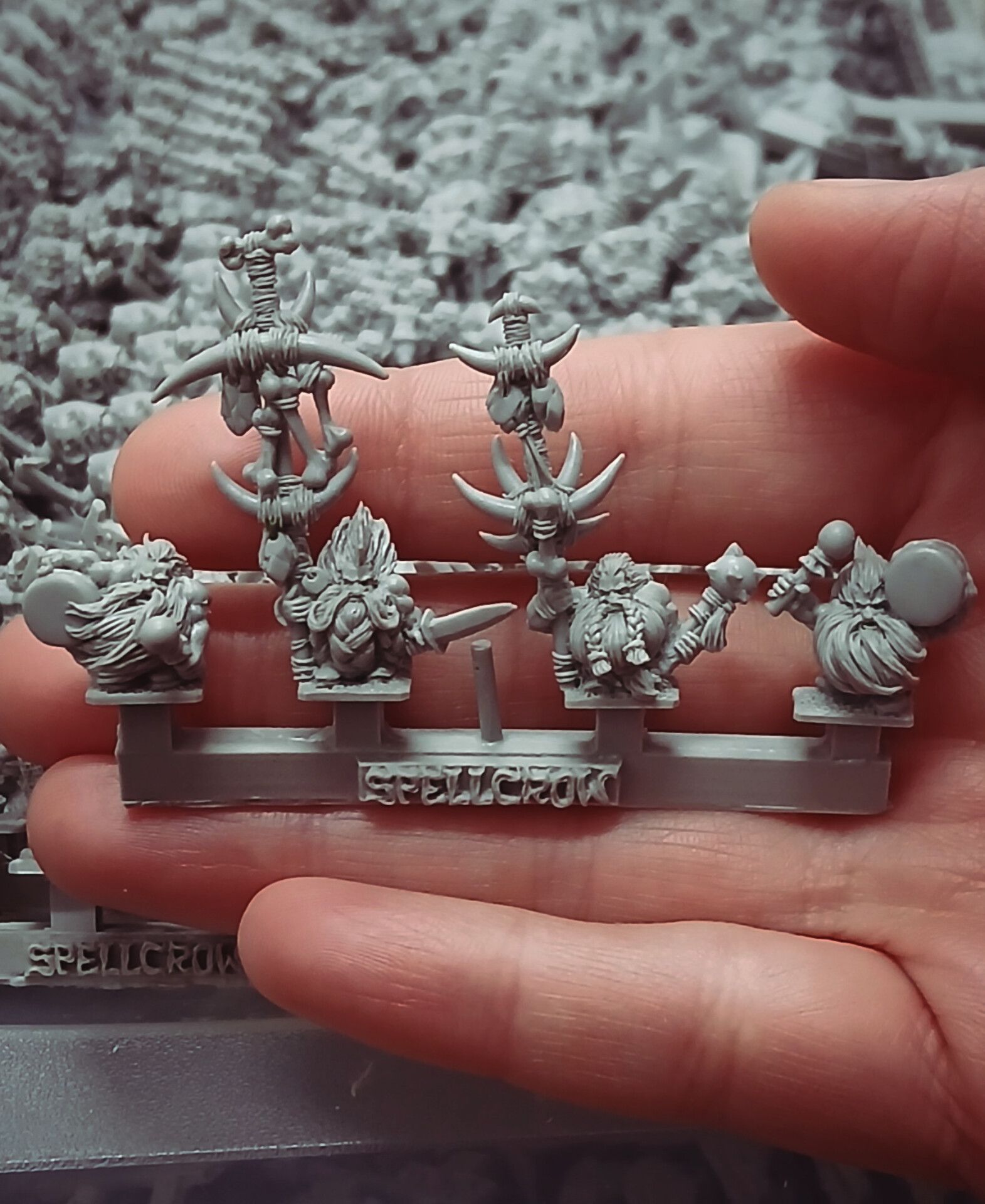 Hello guys! We’re very happy to finally show you a cast of the Dwarves Command Group belonging to the Raghorn clan! ⚔️ You can clearly see all the amazing details sculpted by Marek – but there was also a lot of work on our side to make sure the banners cast well and don’t break during your games. We use various tricks so the banners look delicate and openwork, while still being durable and not easy to break.