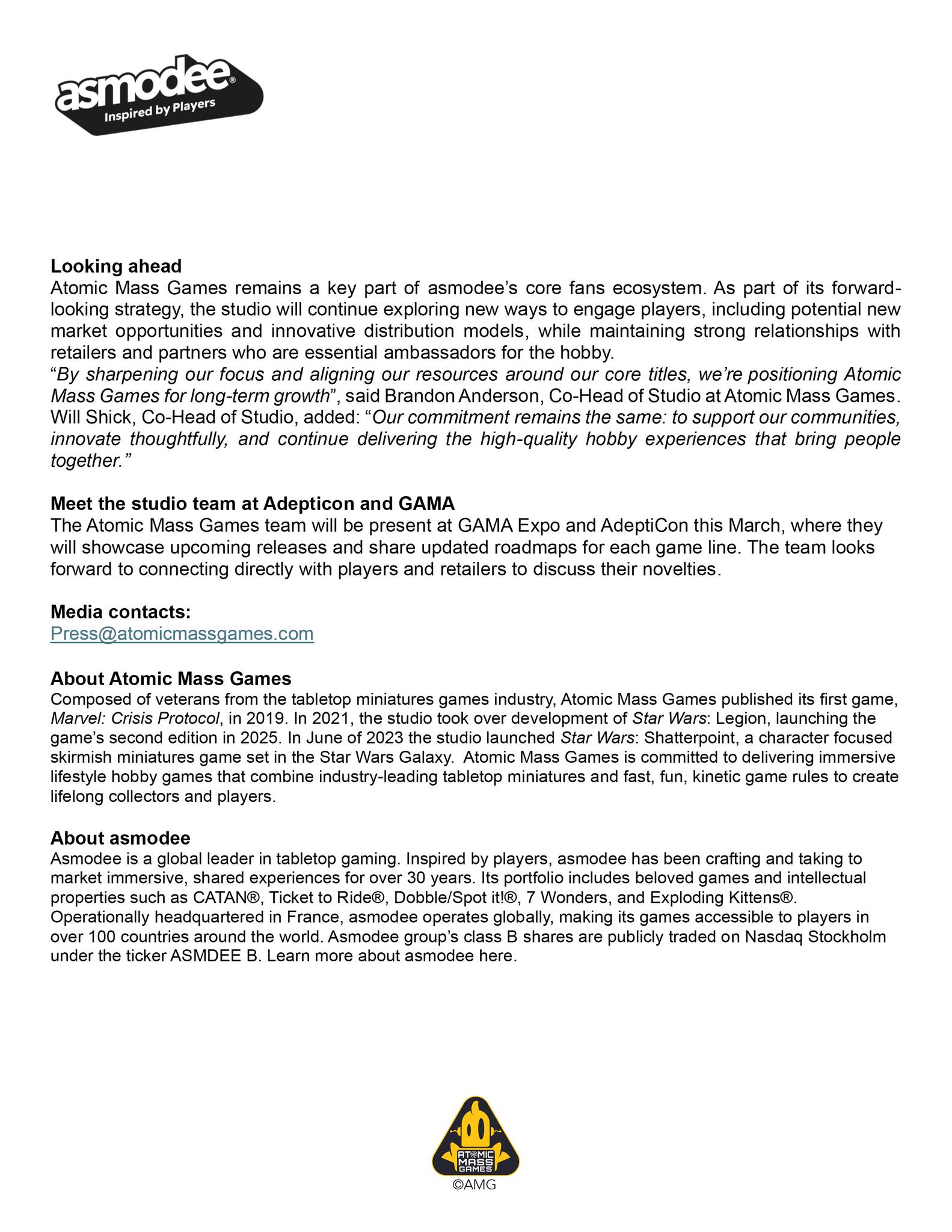 Atomic Mass Games remains a key part of asmodee’s core fans ecosystem. As part of its forward-looking strategy, the studio will continue exploring new ways to engage players, including potential new market opportunities and innovative distribution models, while maintaining strong relationships with retailers and partners who are essential ambassadors for the hobby.