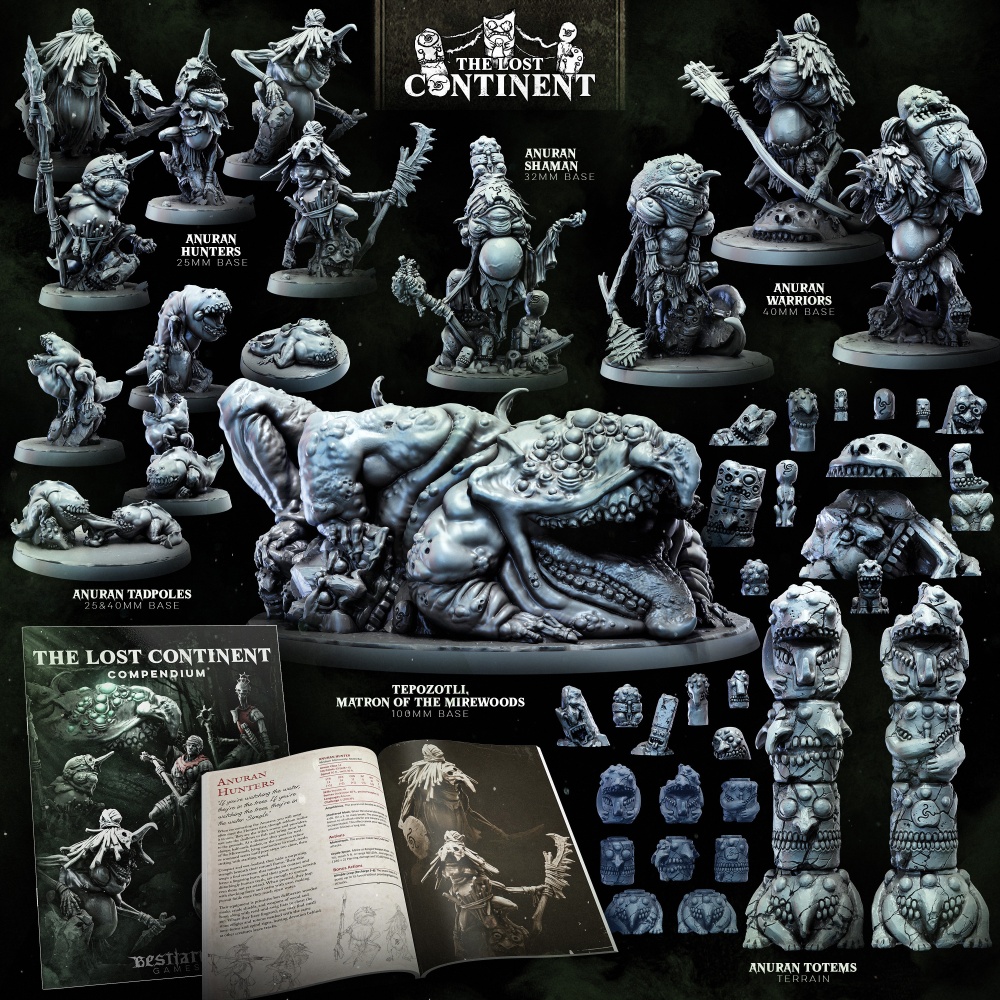 This month, the horrors of the Lost Continent are swelling up from the Mirewoods in the form of the Brood of the Toadmother, our new monthly Miniatures Collection built around Tepozotli, Matron of the Mirewoods, her twisted Anuran brood, and the idols, totems, and swamp-wrought relics that mark their territory.