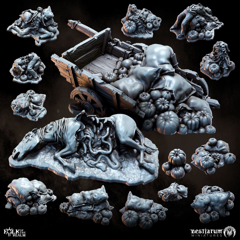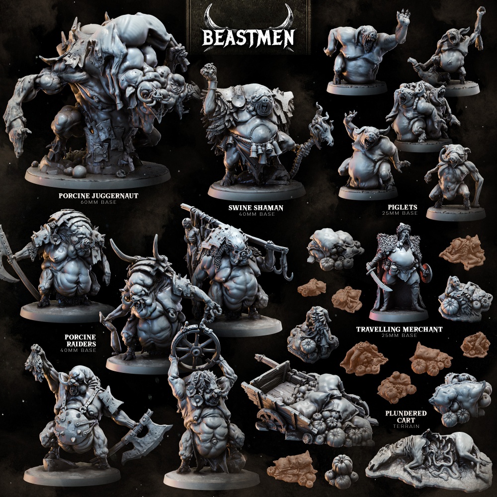 This new collection delivers a decidedly meaty new addition to the Beastmen, a tribe of porcine terrors bent on raiding, pillaging and feasting themselves upon the spoils. Plus – an awesome Plundered Cart terrain set, and an extremely beleaguered hero.
