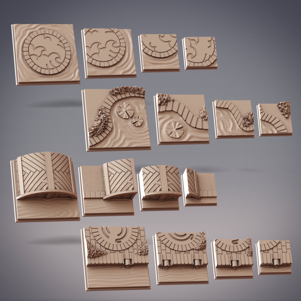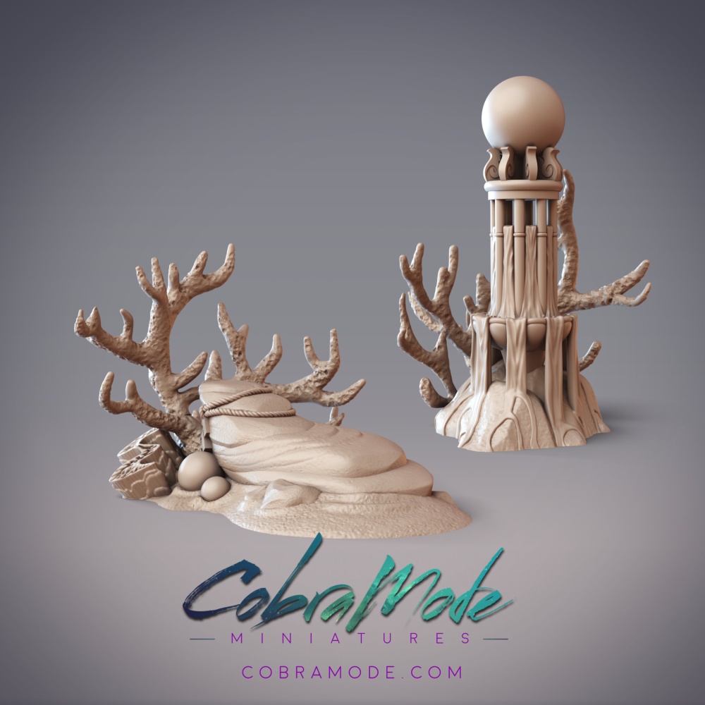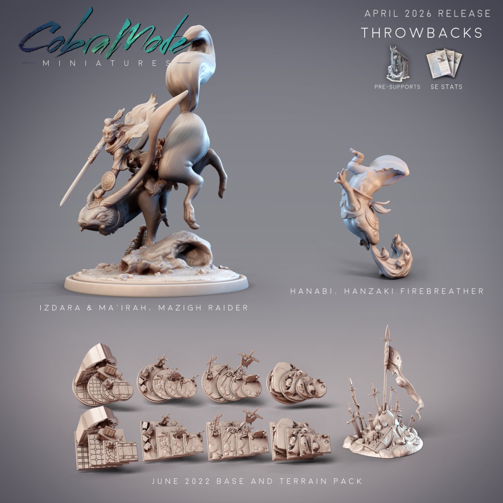 This month’s fantastic base and terrain pack was sculpted by Calrais, with concepts by Paul Ferret (who also does concepts for our characters). Our throwback bonus this month includes Hanabi, Hanzaki Firebreather, Izdara, Mazigh Raider, and the June 2022 Bases and Terrain Pack.