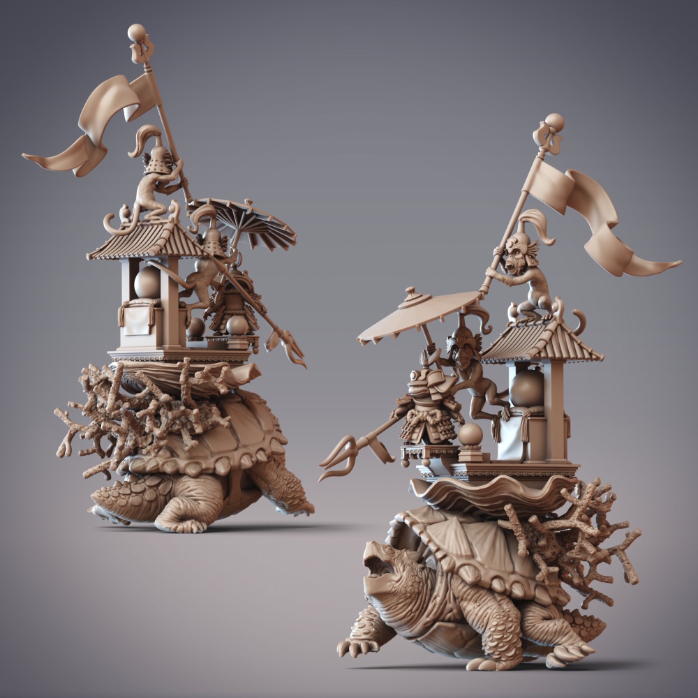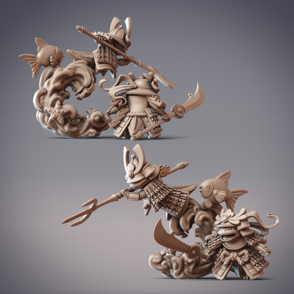 We’ve gone back to our roots with April’s collection of Hanzaki from Norinaga’s faction of the Pearl. The secret pearl farms are heavily guarded, as top quality pearls can be worth as much as a kingdom. Each pearl is infused with condensed Qi, making each a powerful magical item that can’t be replicated. Because of this, Norinaga’s forces are extremely experienced fighters with more organization than other Hanzaki factions – they’re capable of repelling both armies and thieves, kings and rogues (and other Ryujin, of course). This capability is personified in the three generals, Hayanami, Hanamori, and Hajiroku, who each bring their unique skills to the table. Of course, no general is effective without footsoldiers like the Heishi, special operatives like Hanegiri, a ninja defector from another faction, or giant snapping turtle command centers!