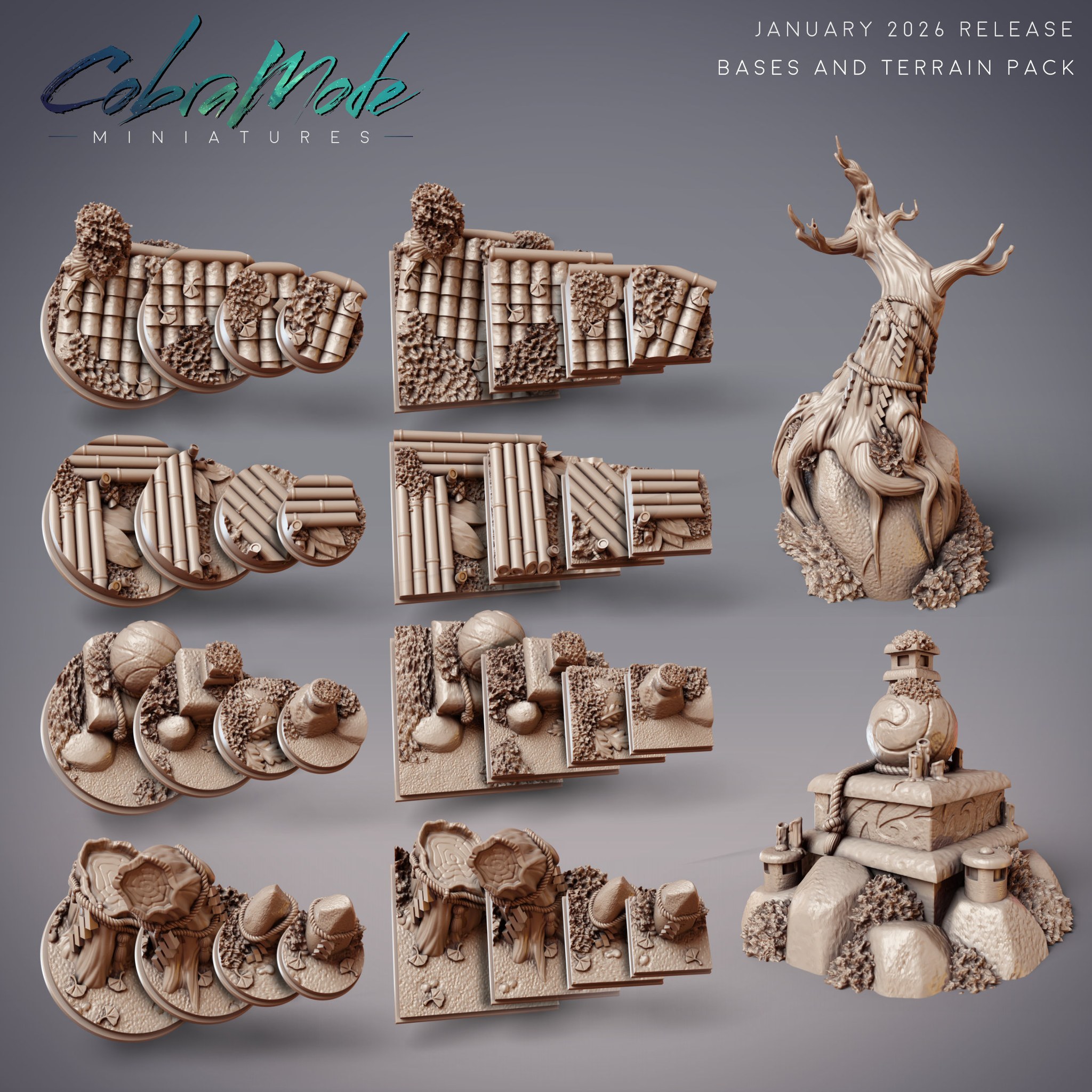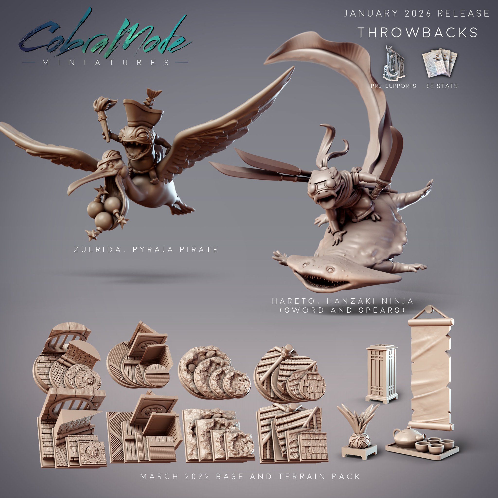 Subscribe this month on Patreon and Tribes to get the full collection, including thematic bases and terrain, throwback minis (this month includes another matching thematic base and terrain pack, alongside some fun extra minis!), welcome bonus, and loyalty bonuses for those who stay for 3 or more months.