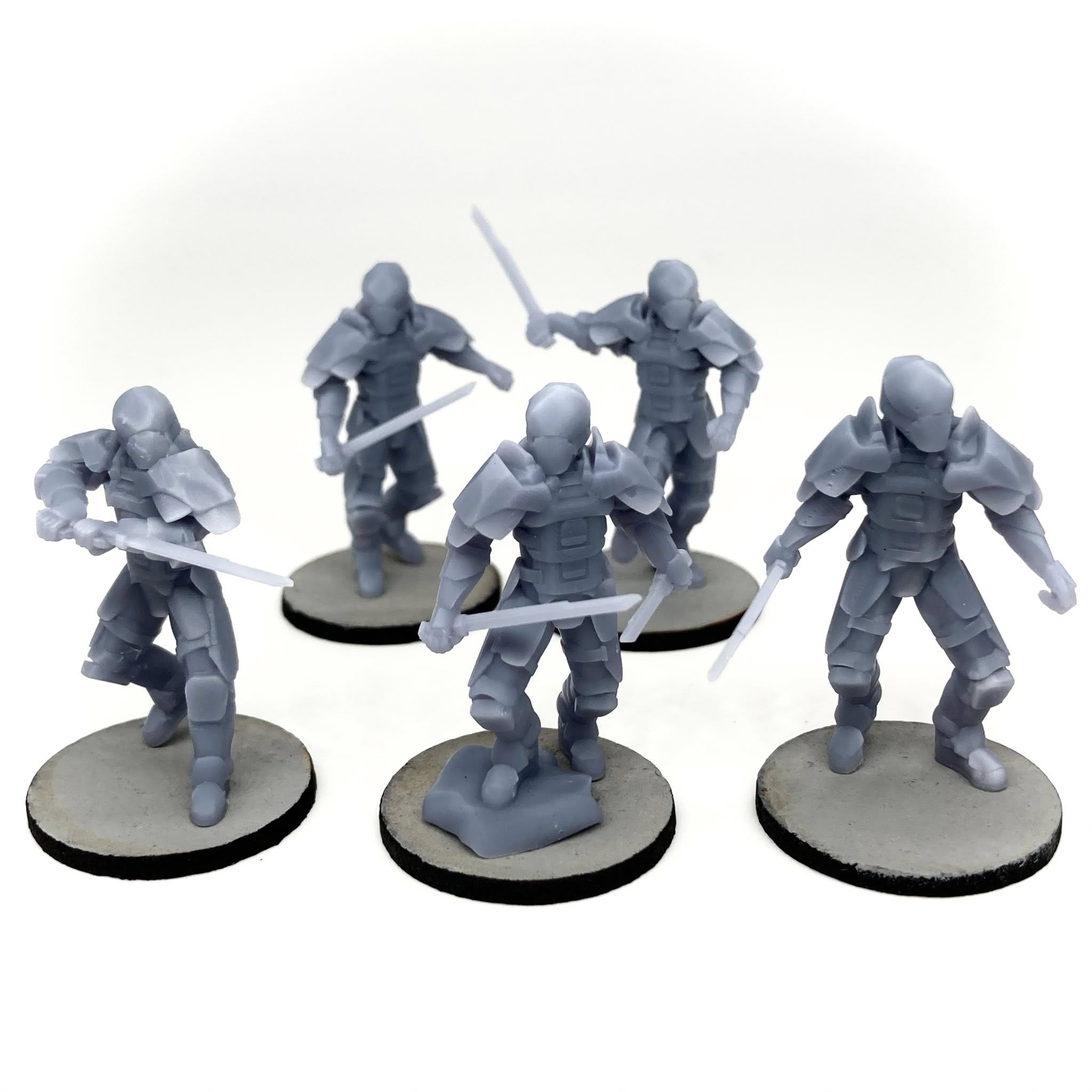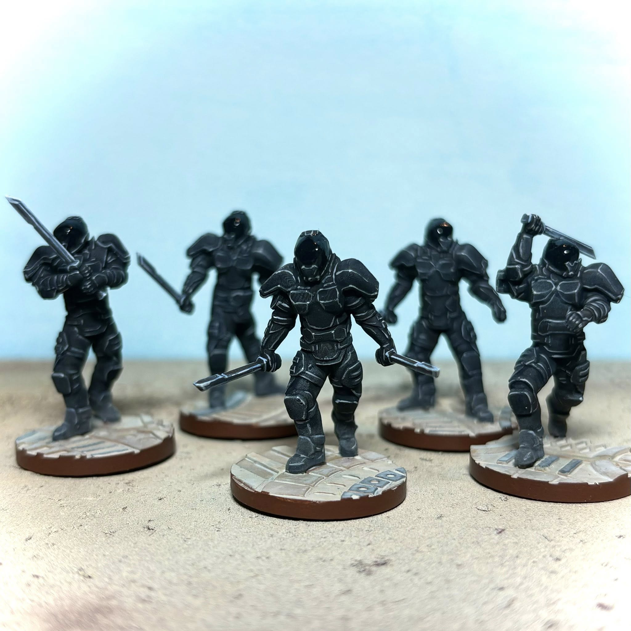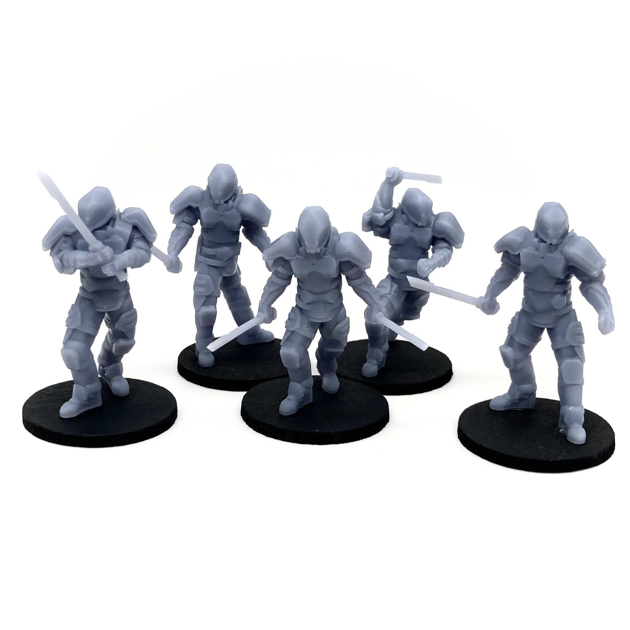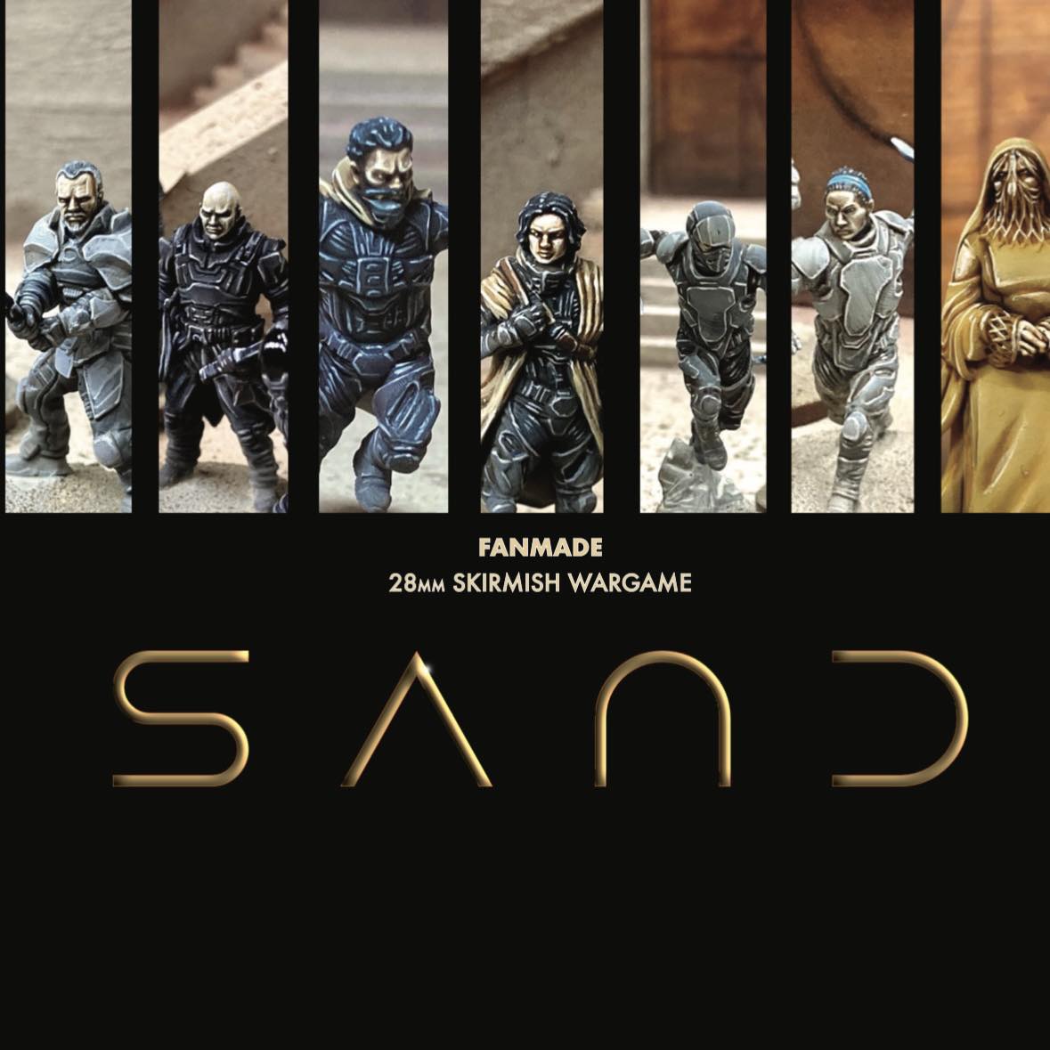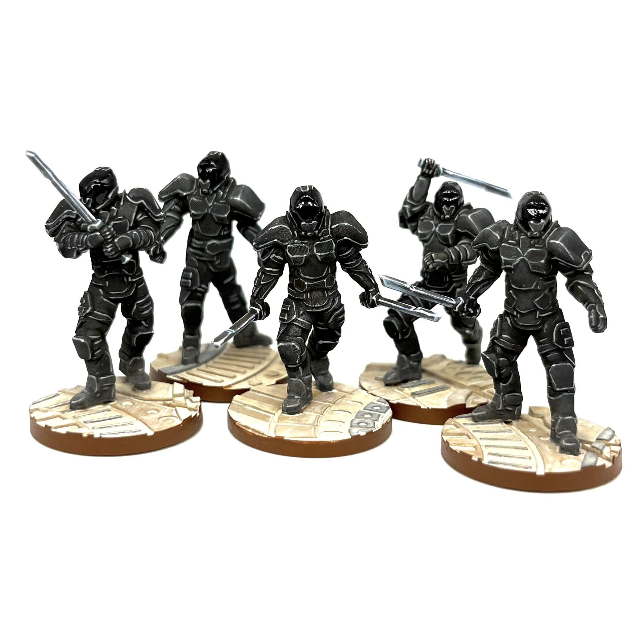 I sculpted my own set of SAND miniatures for use with my game system! This was a BIG jump for me as organics are not normally my thing but I’m really pleased with how these came out. The set contains a team of 5 warriors in various fighting poses, one of which is suitably cool looking to be the leader. There’s also a bonus sixth sculpt saluting with his blade.