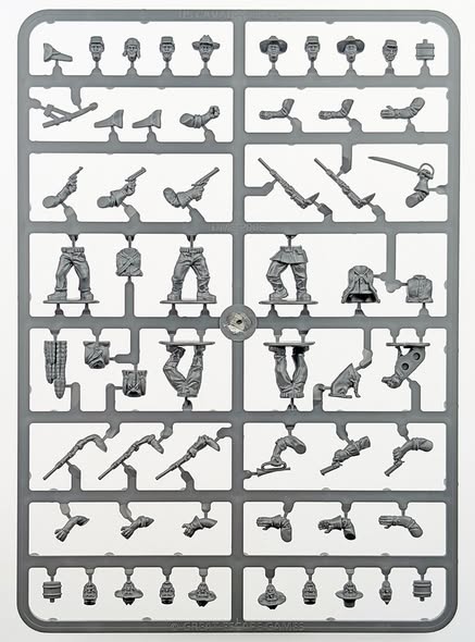 Armed with pistols, carbines, and frontier grit, they bring discipline and firepower to a town where justice walks tall and trouble never sleeps. The figures in this box set can be used to represent either the U.S. Cavalry or Buffalo Soldiers Factions from Dead Man’s Hand. Includes 10 multipart plastic miniatures with more customisation options than a quartermaster on payday. The sprue’s packed with pistols, cavalry carbines, and everything you need to arm your troop, optional extras include a trusty dog, ready to sniff out trouble or steal the scene.