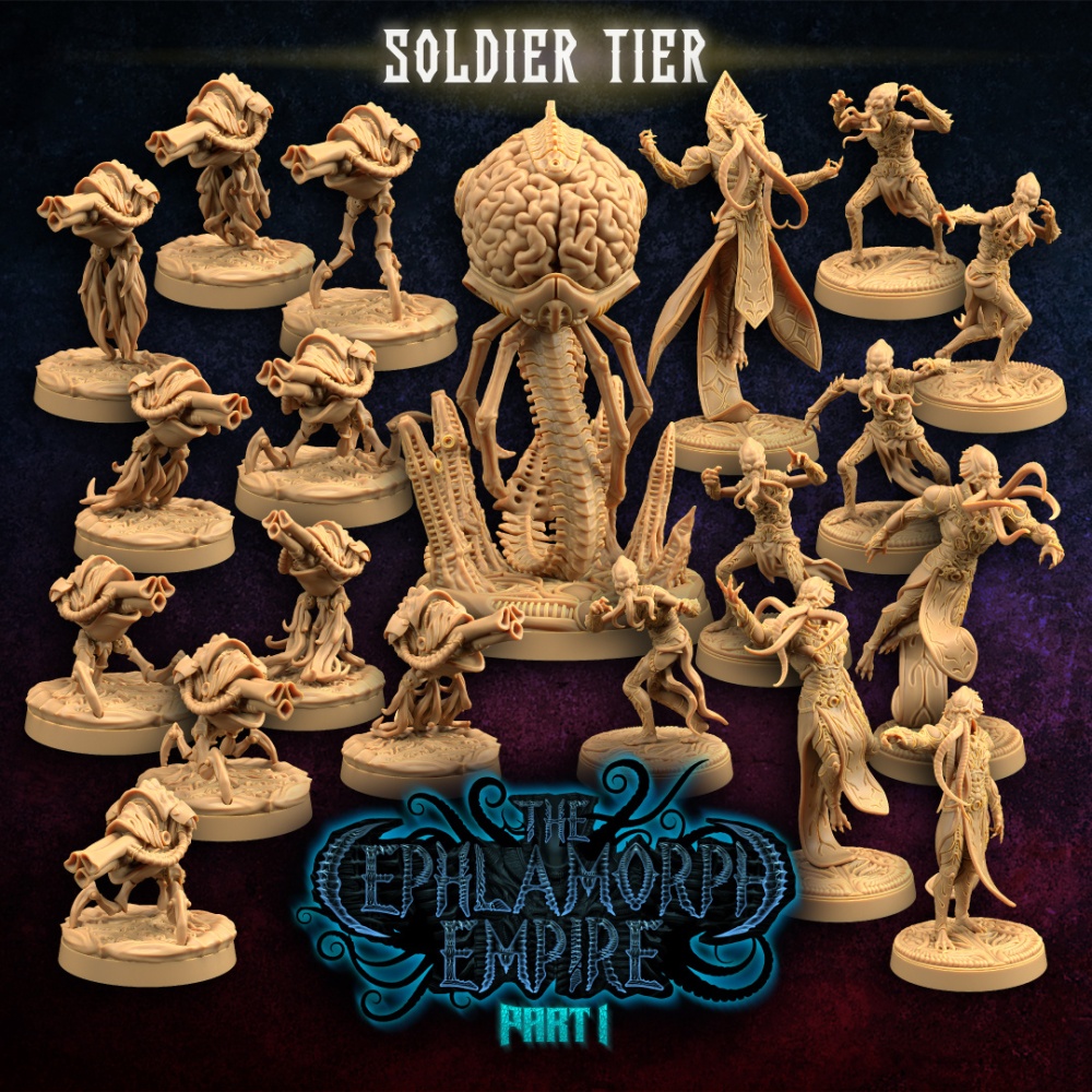 Soldier Tier has our first army designed exclusively for Grim Dark Future! The Cephlamorph Empire Pt. 1 have come to twist the minds and use their terrifying bio-mechanoids to crush any who might stand in their way of conquest and control. With powerful psychic powers as well this is one army that will strike a raw, eldritch fear into their opponents!