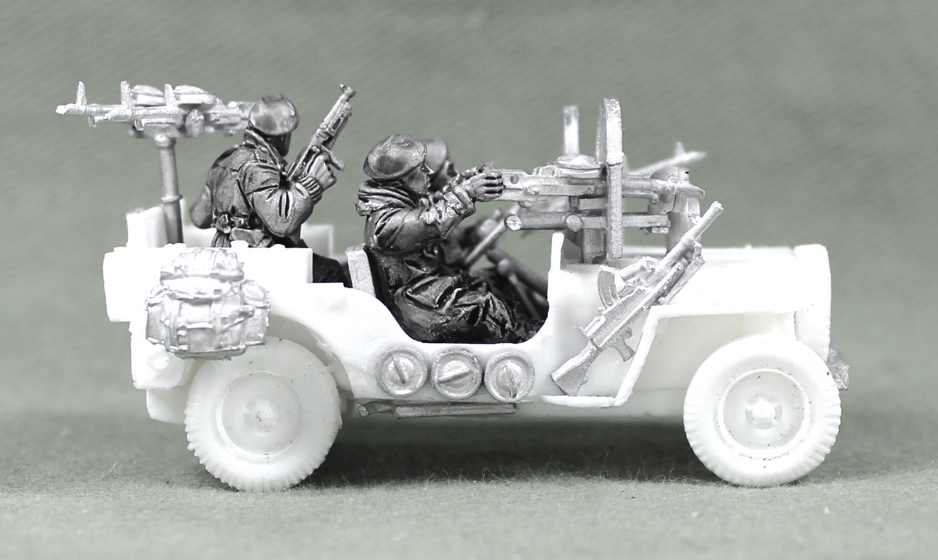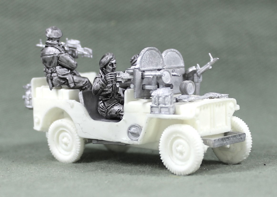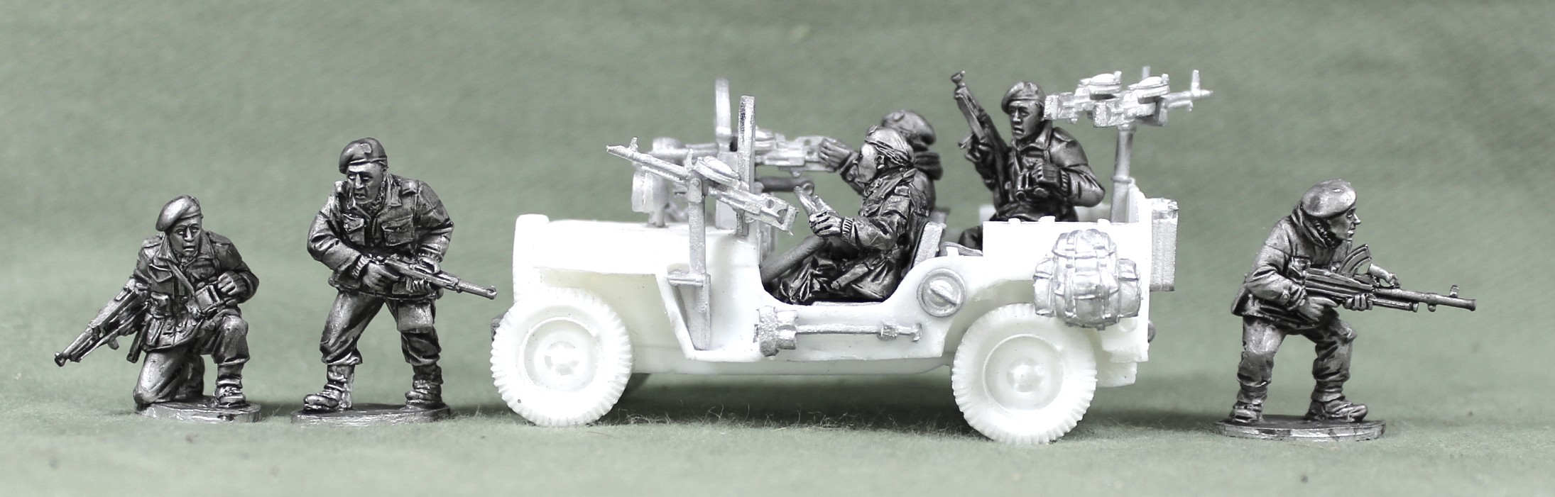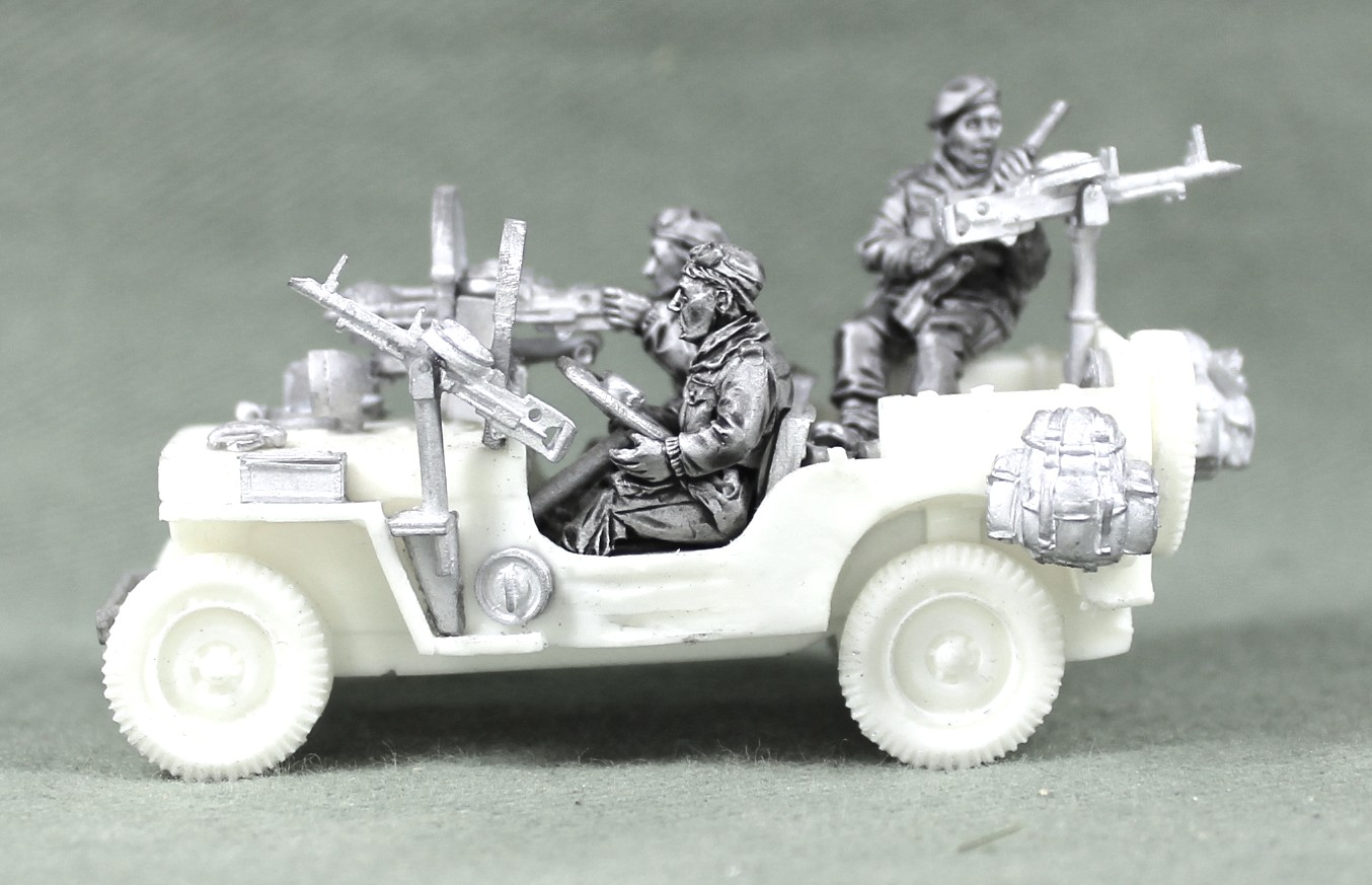 NEW RELEASE!!!!Two 28mm SAS JEEPS and crews released.SAS units were forward of the main armies for most of the NWE conflict in 1944/45. Notably during Market Garden as they patrolled trying to find ways through the German defences sometimes linking into Phantom Communications units.It was tasked with parachute operations behind the German lines in France and carried out operations supporting the Allied advance through France (Operations Houndsworth, Bulbasket, Loyton, Kipling and Wallace-Hardy), Belgium, the Netherlands (Operation Pegasus), and eventually into Germany (Operation Archway and Operation Howard).As a result of Hitler’s issuing of the Commando Order on 18 October 1942, the members of the unit faced the additional danger that they would be summarily executed if captured by the Germans. In July 1944, following Operation Bulbasket, 34 captured SAS commandos were indeed summarily executed by the Germans; in October 1944, in the aftermath of Operation Loyton, another 31 captured SAS commandos were summarily executed by the Germans.Worth noting than in March 1944 the SAS units were merged into airborne command and swapped their famous sand berets for airborne maroon.