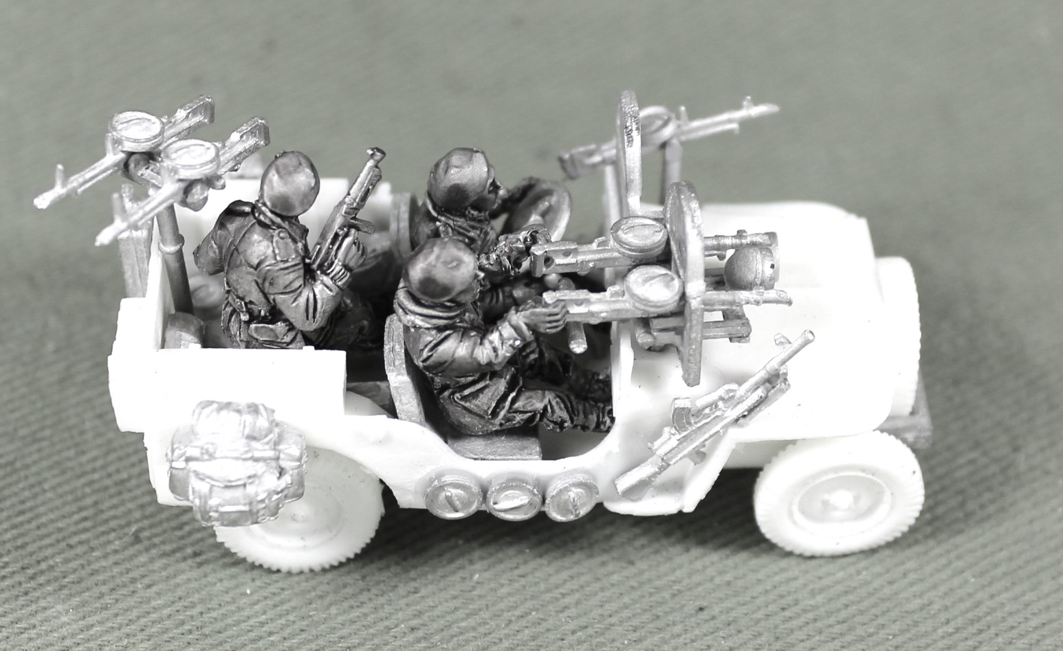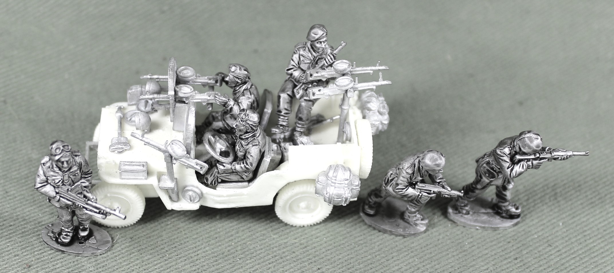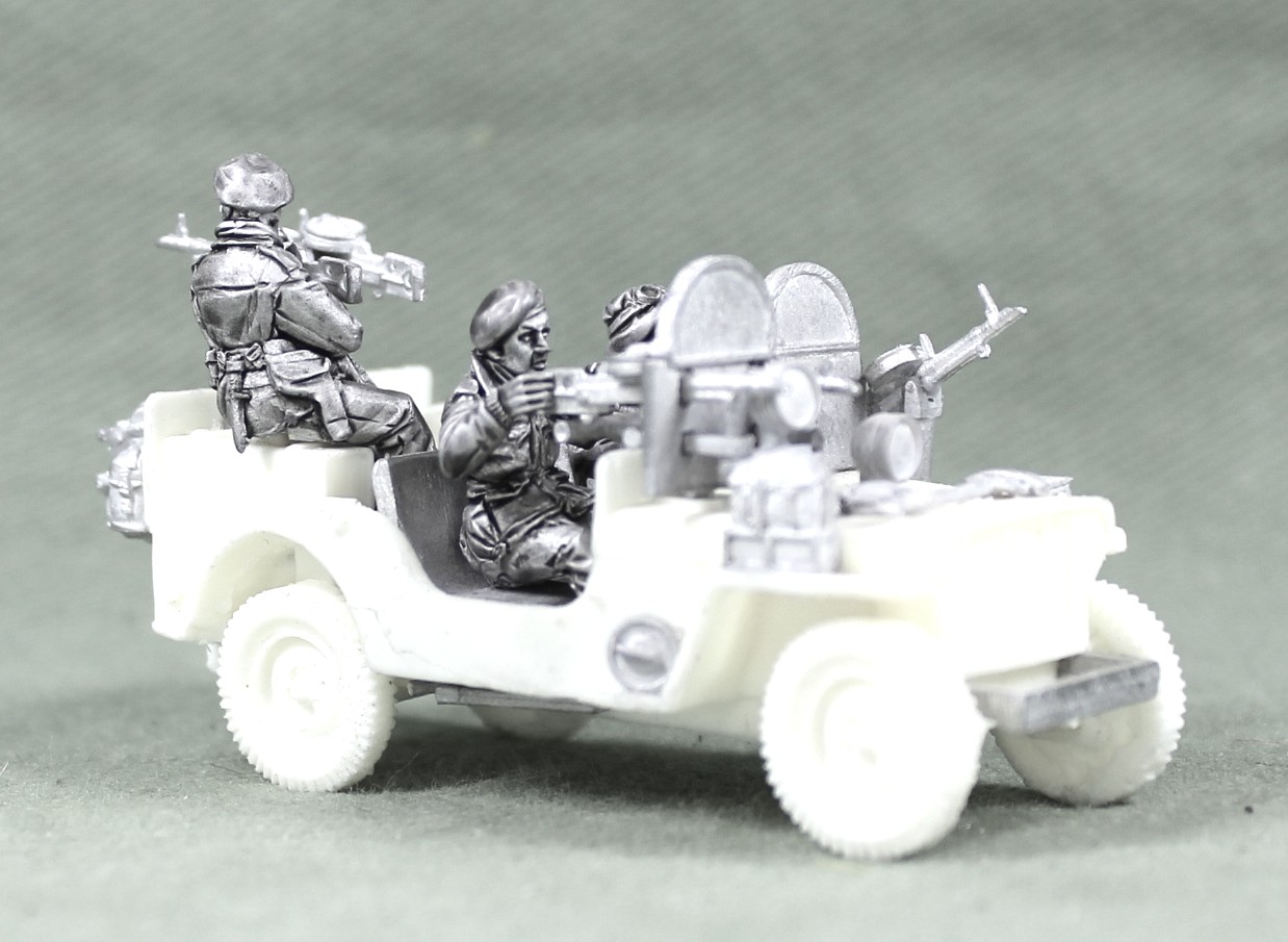 NEW RELEASE!!!!Two 28mm SAS JEEPS and crews released.SAS units were forward of the main armies for most of the NWE conflict in 1944/45. Notably during Market Garden as they patrolled trying to find ways through the German defences sometimes linking into Phantom Communications units.It was tasked with parachute operations behind the German lines in France and carried out operations supporting the Allied advance through France (Operations Houndsworth, Bulbasket, Loyton, Kipling and Wallace-Hardy), Belgium, the Netherlands (Operation Pegasus), and eventually into Germany (Operation Archway and Operation Howard).As a result of Hitler’s issuing of the Commando Order on 18 October 1942, the members of the unit faced the additional danger that they would be summarily executed if captured by the Germans. In July 1944, following Operation Bulbasket, 34 captured SAS commandos were indeed summarily executed by the Germans; in October 1944, in the aftermath of Operation Loyton, another 31 captured SAS commandos were summarily executed by the Germans.Worth noting than in March 1944 the SAS units were merged into airborne command and swapped their famous sand berets for airborne maroon.
